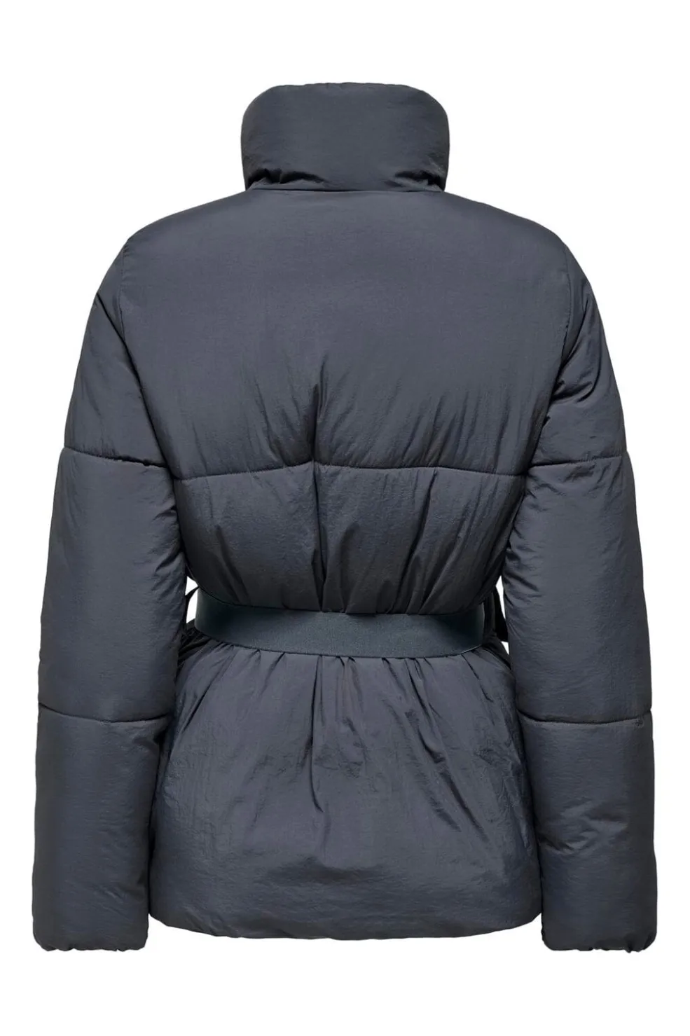 Grå dynejakke fra Only med høj krave og lynlåslukning. Jakken har praktiske lommer på brystet og i siderne samt et bælte i taljen til justering af pasformen.