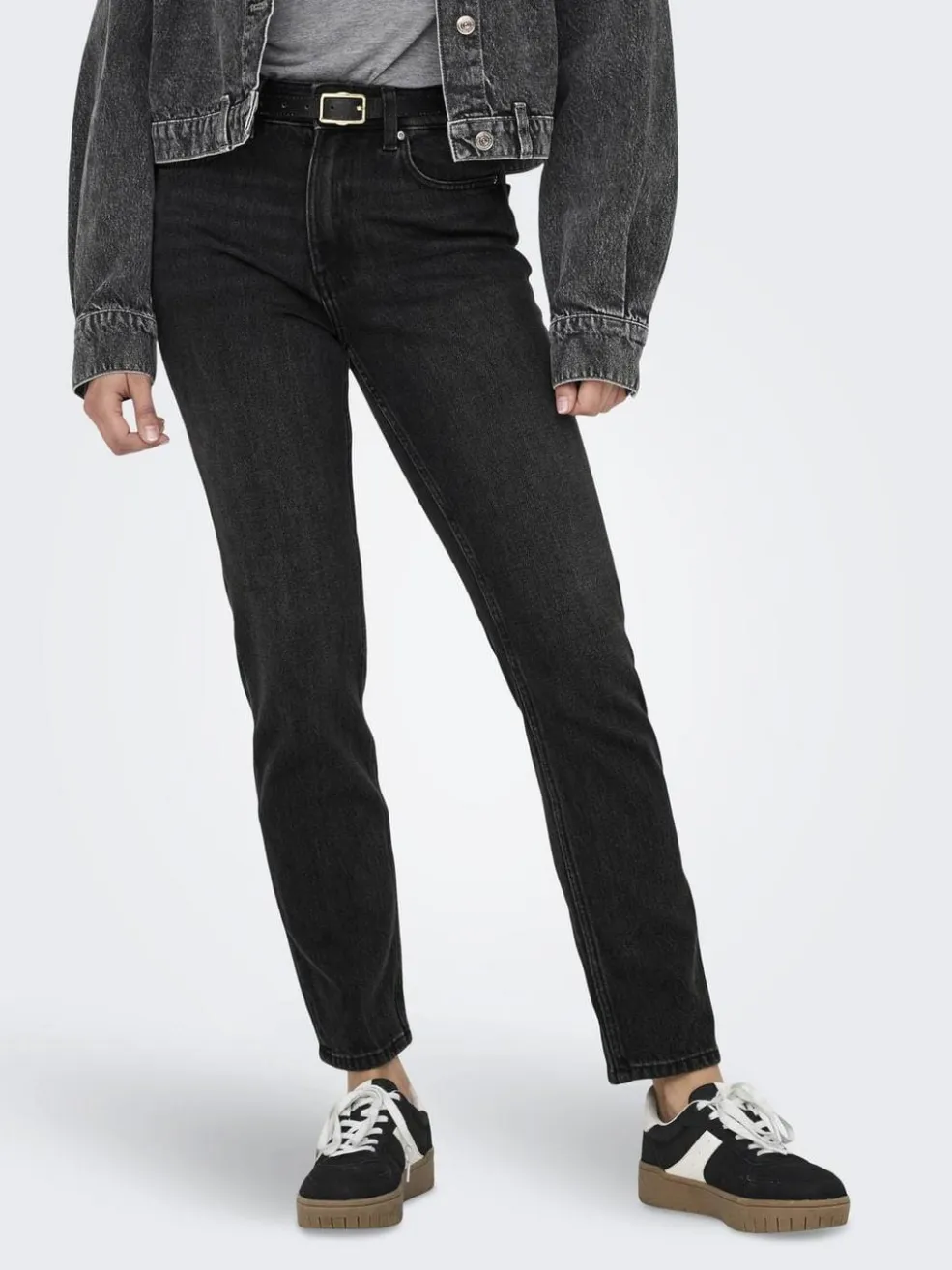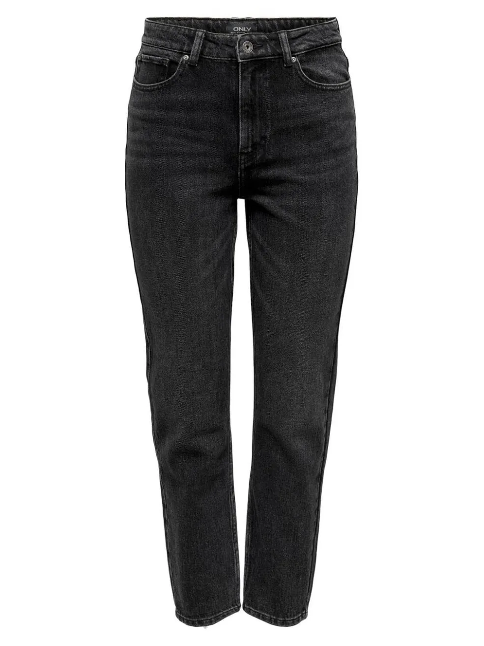 Sorte denimjeans fra Only med høj talje og straight fit. Bukserne har en behagelig pasform med plads omkring lårene og lukkes med både knapper og lynlås.