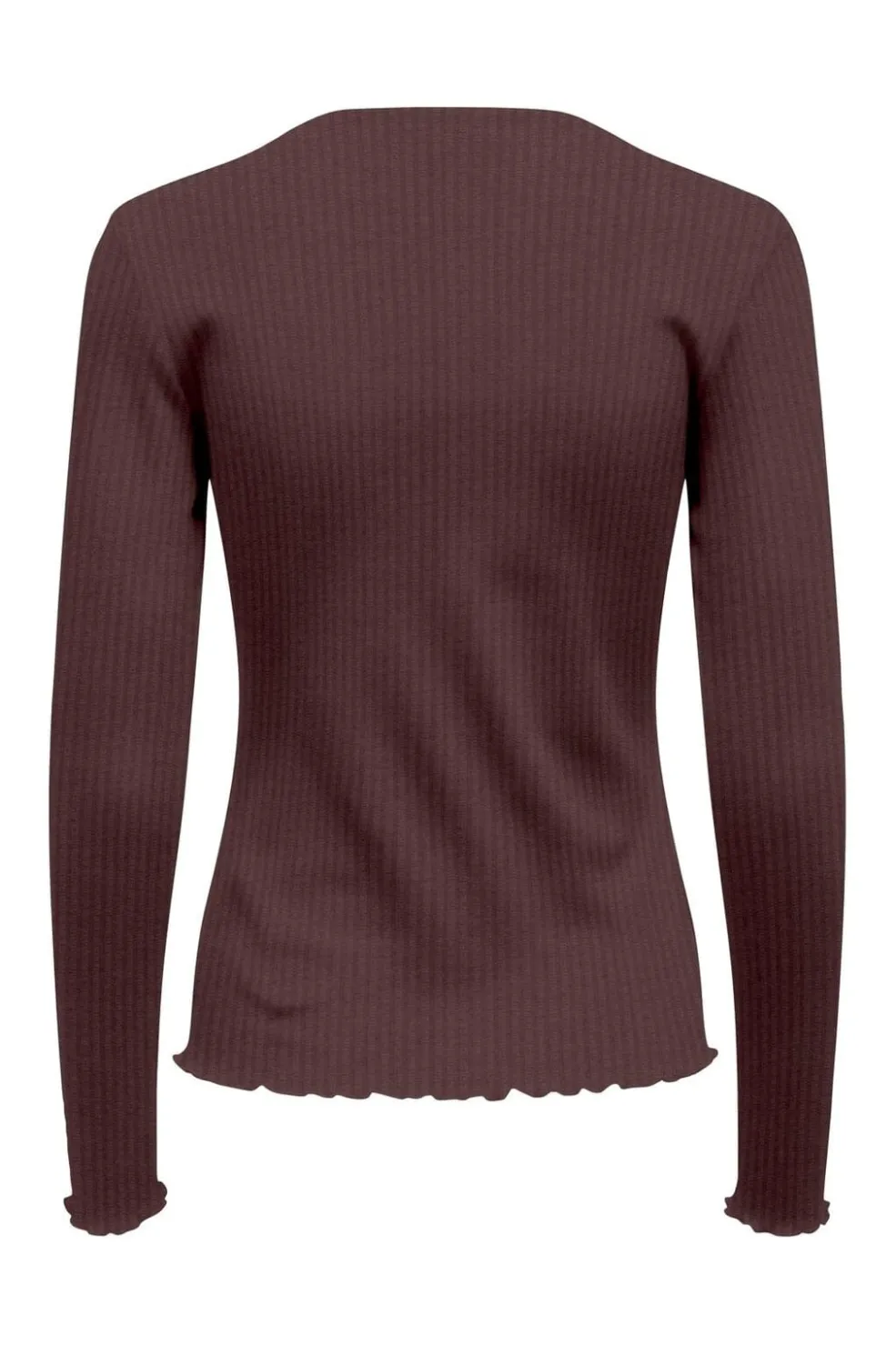 Brun ribstrikket top fra Only med rund halsudskæring og lange ærmer. Toppen har en regular fit-pasform og bølgede kanter ved ærmerne og bunden.
