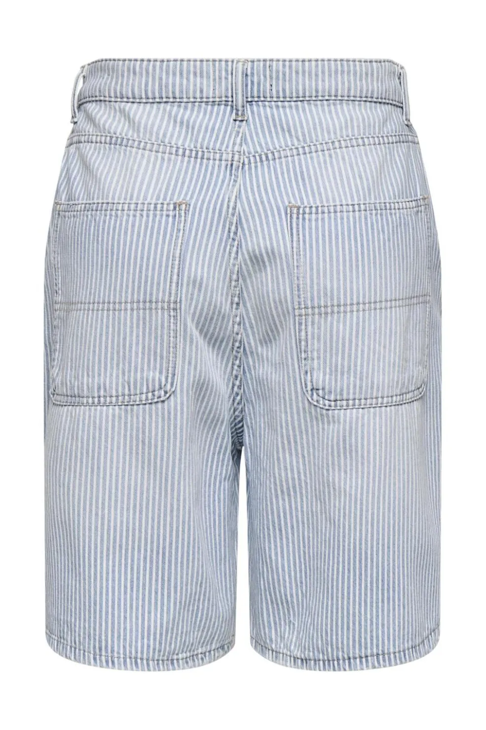 Stribede shorts fra Only i lyseblå denim med hvide striber. Shortsene har en løs pasform og når til midt på låret. De har lynlås og knapper i taljen.