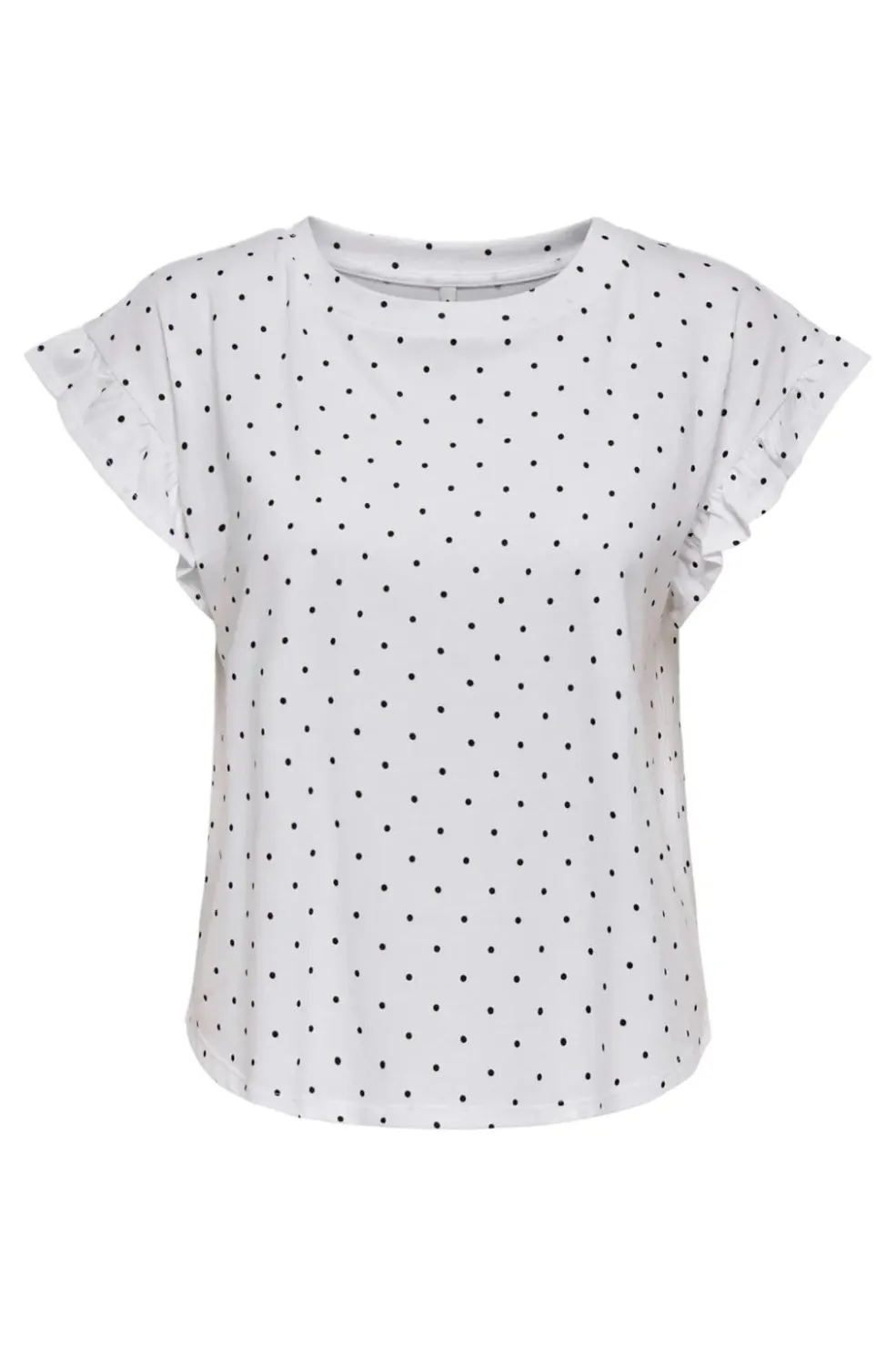 Hvid top fra Only med sorte prikker. Toppen har korte ærmer med flæsedetaljer og en rund halsudskæring. Den lette og luftige top kommer i en regular fit.