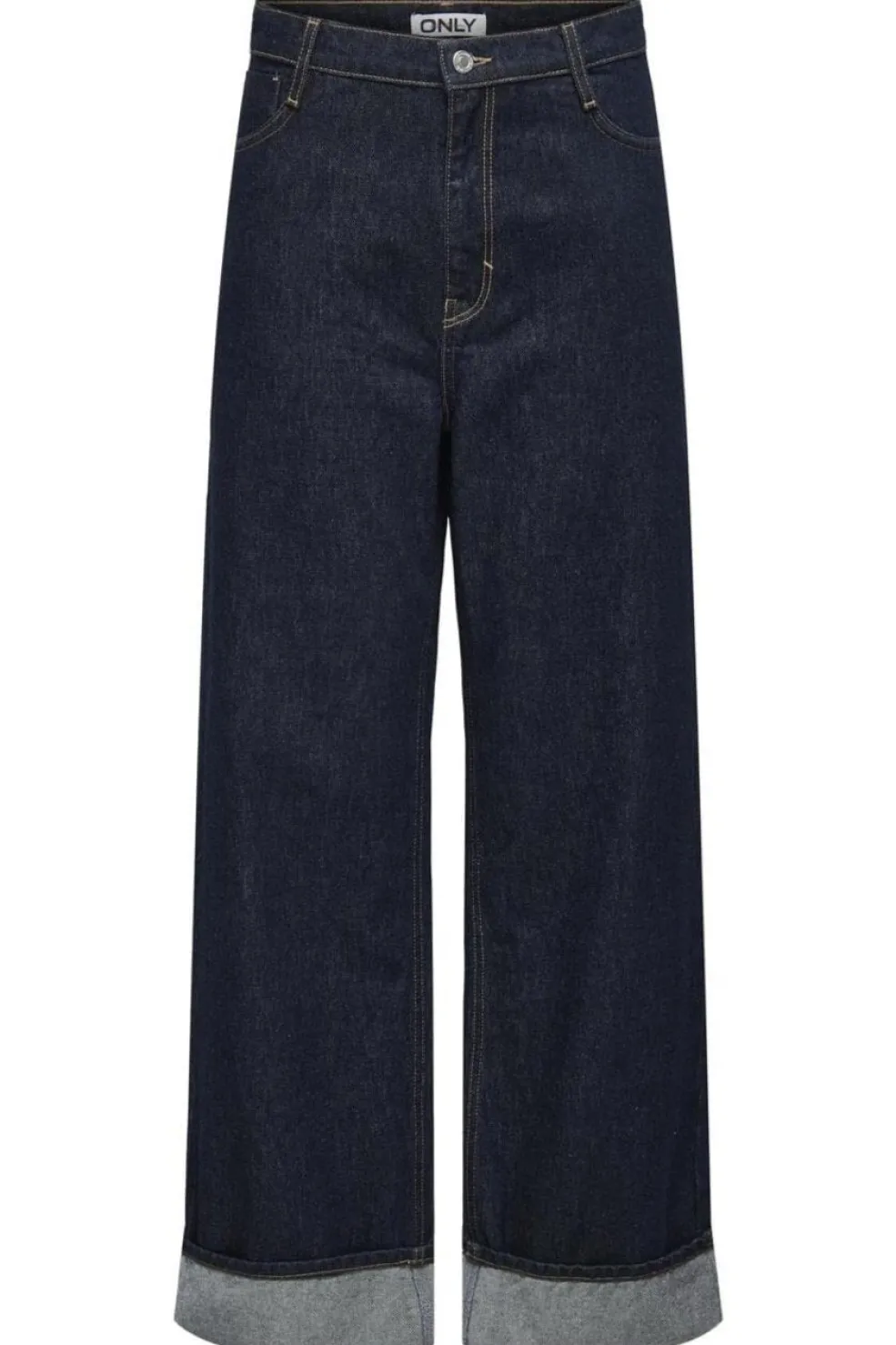 Mørkeblå jeans fra Only med høj talje og vide ben. De har opsmøg ved benene og en løs pasform, der giver god bevægelsesfrihed.