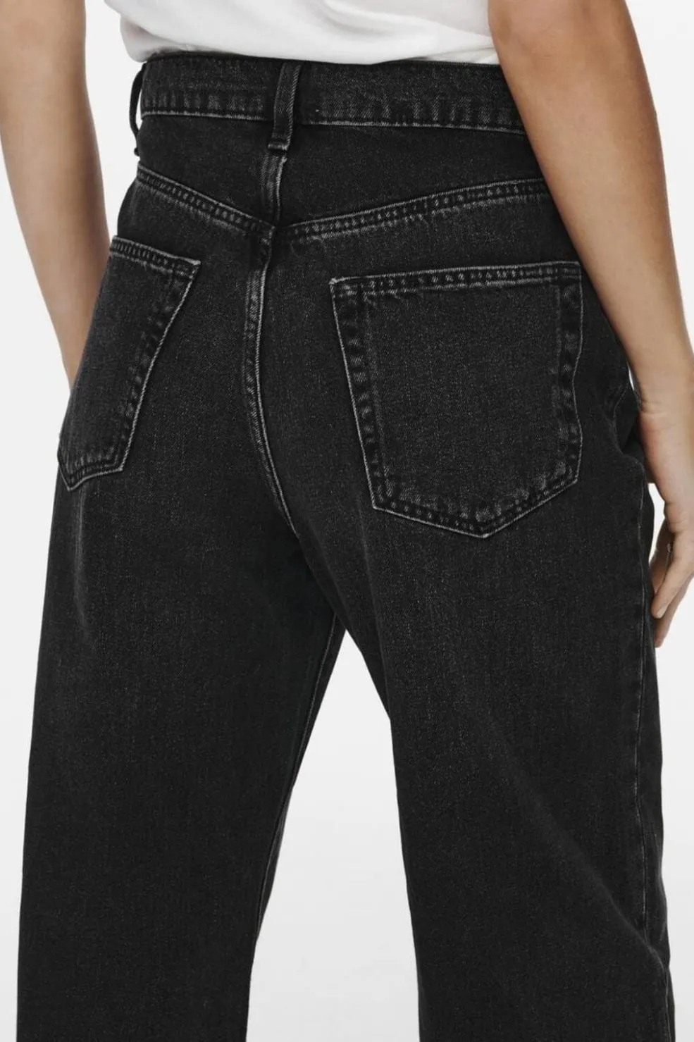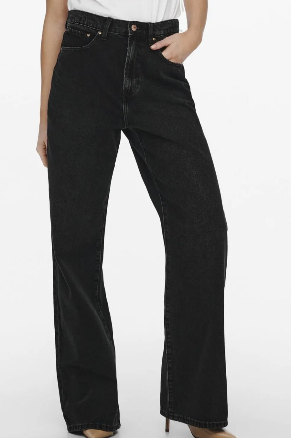 Sorte jeans fra Only med høj talje og bred benåbning. Bukserne har en loose fit-pasform og ankellængde med praktiske baglommer og lynlåslukning.