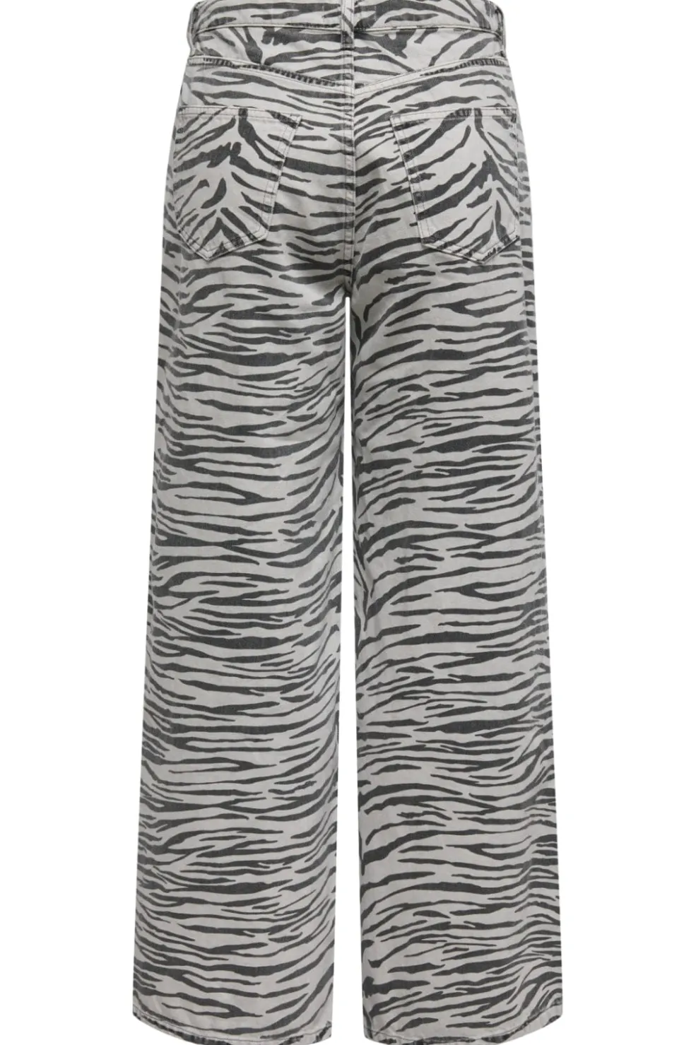 Lysegrå denimbukser fra Only med zebra-print. Bukserne har en bred pasform og høj talje, der kombinerer et karakteristisk mønster med en løs og behagelig silhuet.