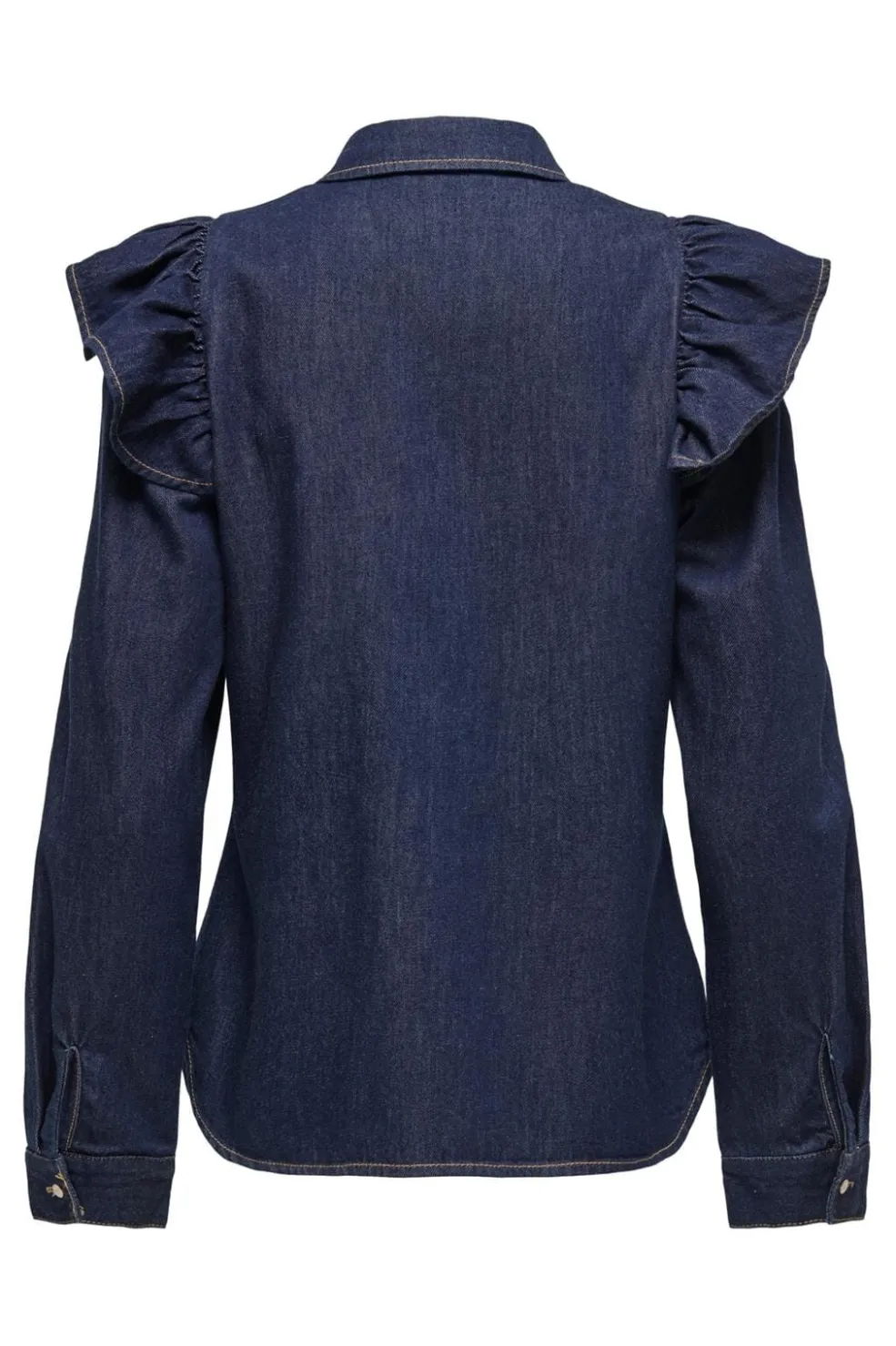 Mørkeblå denimskjorte fra Only med flæsedetaljer på brystet og skuldrene. Den afslappede pasform og den klassiske skjortekrave giver en god kombination af komfort og stil.