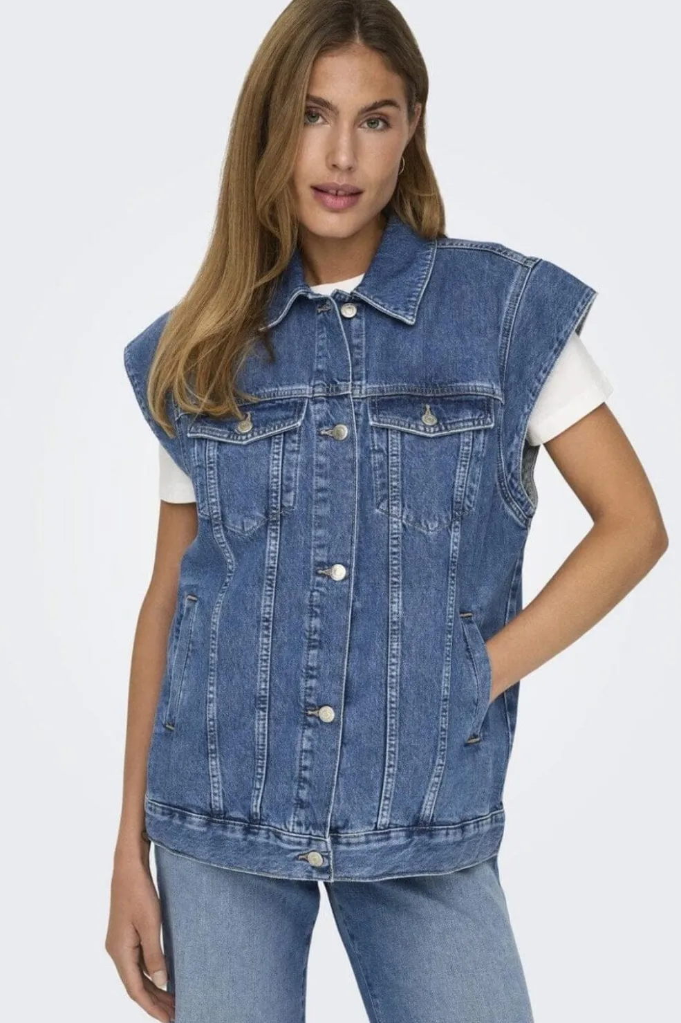 Denimvest fra Only i mellemblå denim med løs pasform. Vesten har spredt skjortekrave og knapper foran. Brystlommer med knaplukning og sidelommer giver praktisk opbevaring.