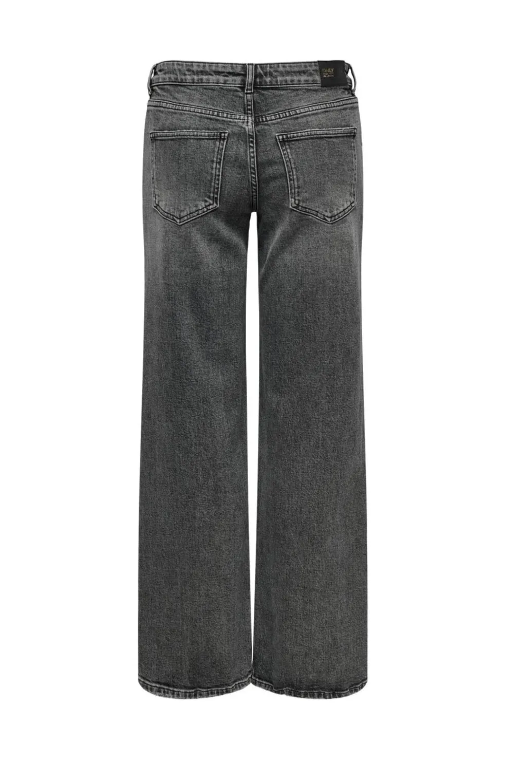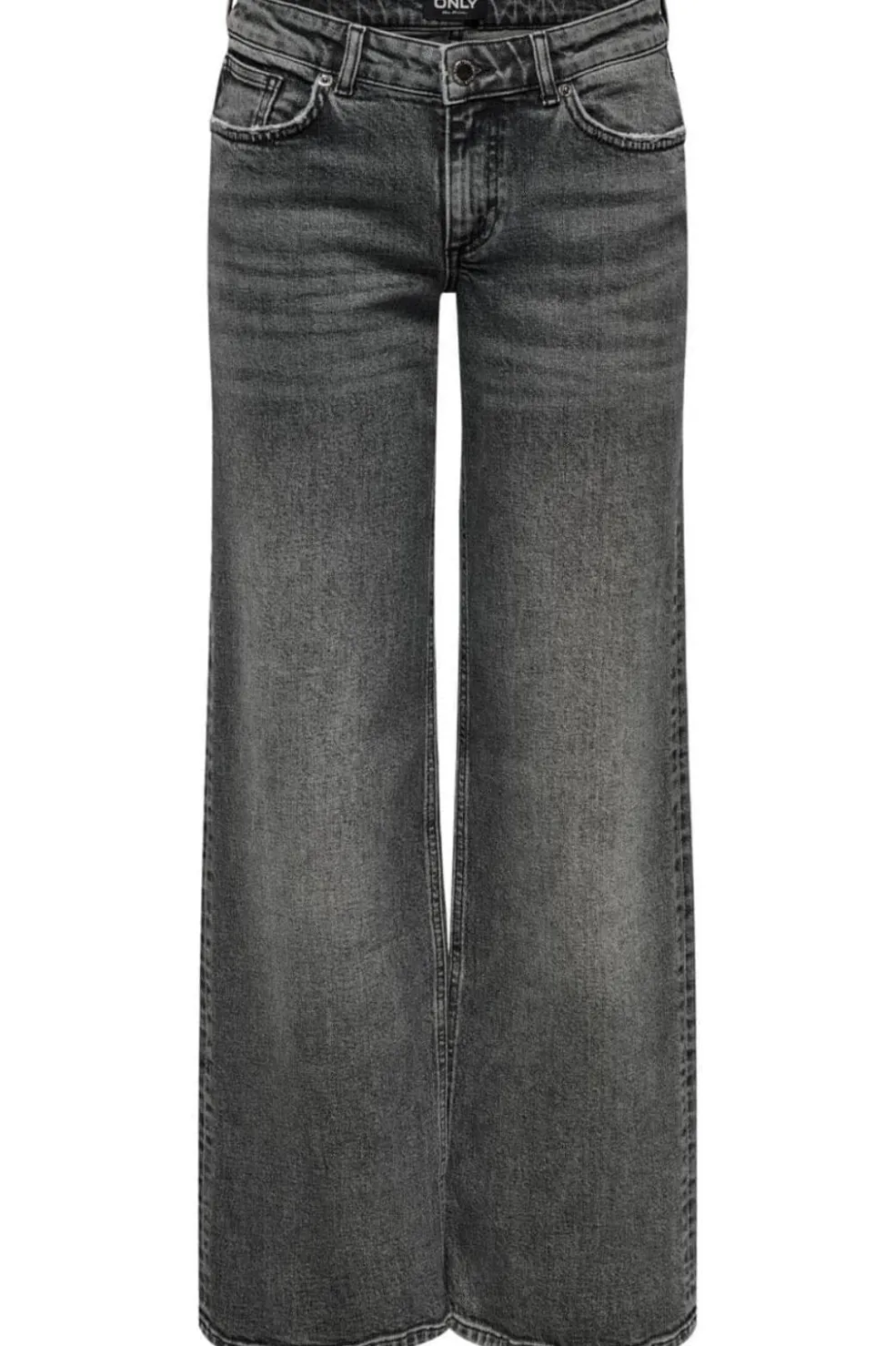 Mørkegrå jeans fra Only med lav talje og vide ben. Bukserne har bæltestropper og lommer både foran og bagpå. Lynlåslukning i gylpen.