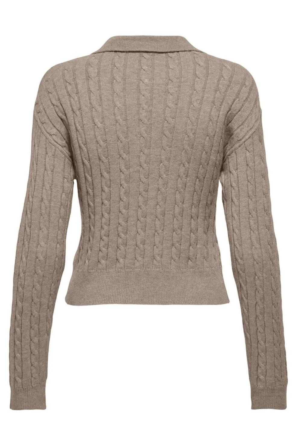 Strikket polo fra Only i en lys beige nuance med kabelmønster over hele trøjen og et lille rødt hjertebroderi på brystet.