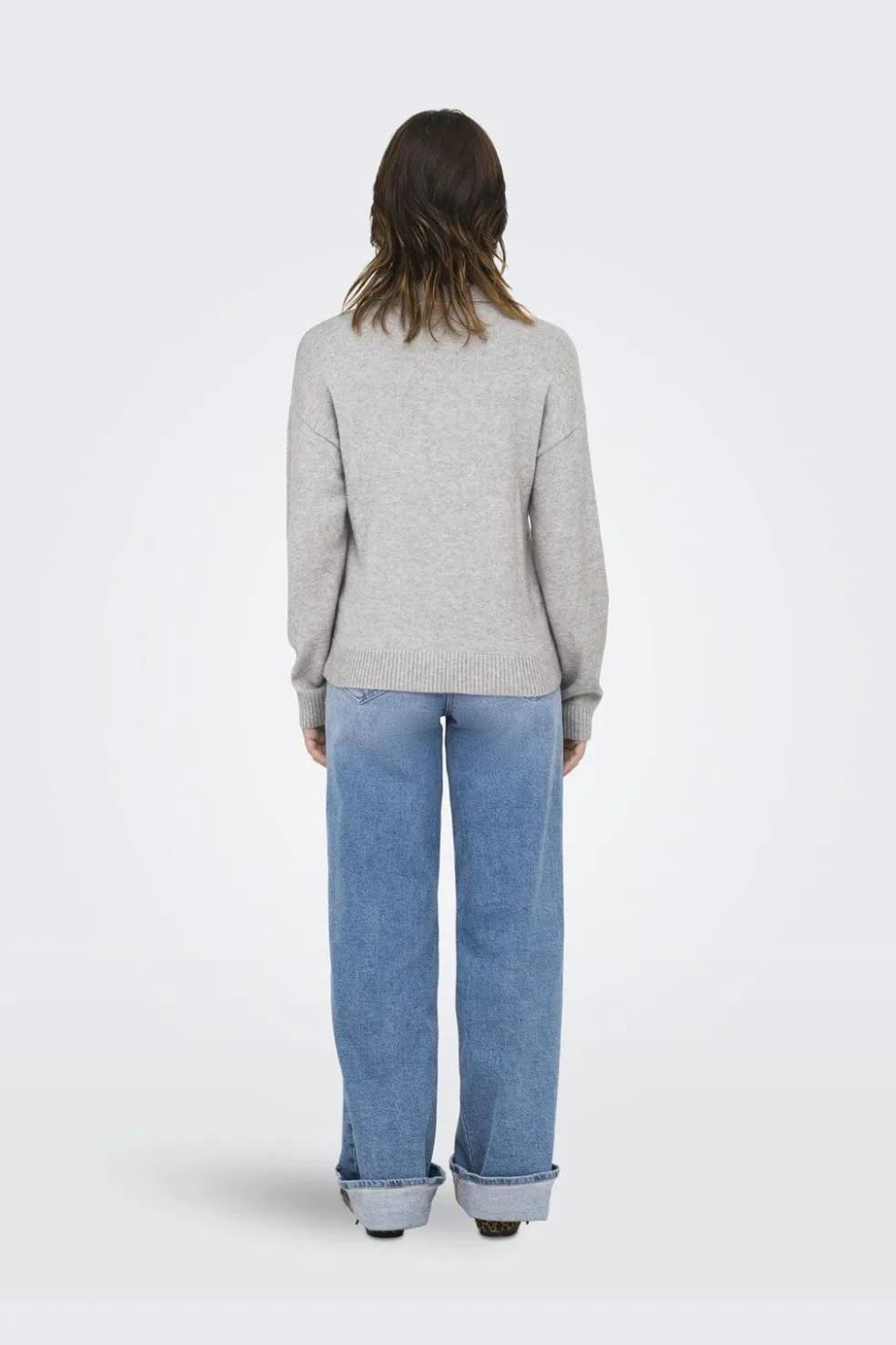 Lys grå strikket pullover fra Only med polokrave og knaplukning. Den har lange ærmer med manchetter og en ribkant forneden.