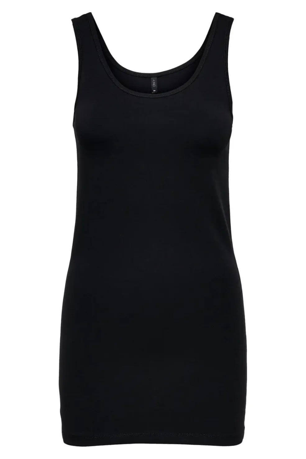 Sort tanktop fra Only med rund halsudskæring og ærmeløst design. Den kropsnære pasform og det enkle design gør den nem at style.