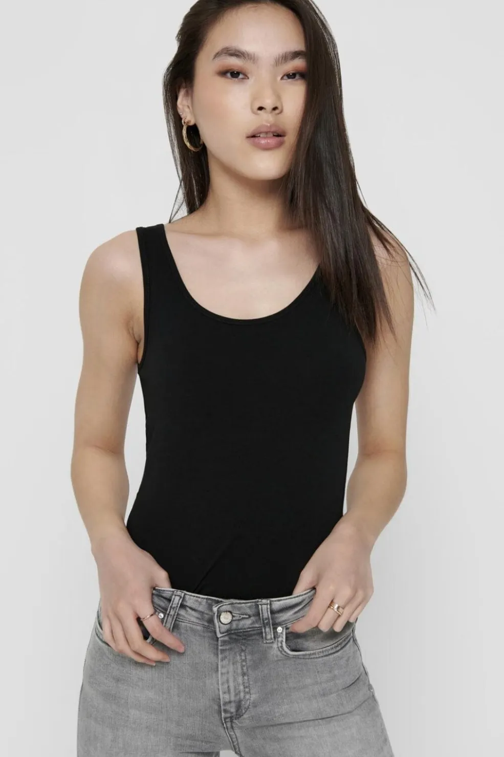 Sort tanktop fra Only med brede skulderstropper og rund hals. Den tætsiddende top har en enkel stil og er fremstillet i en blød bomuldsblanding.