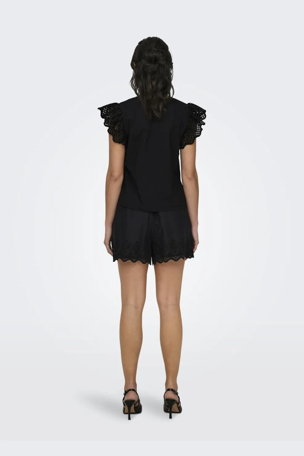 Sort top fra Only med korte ærmer og flæser. Toppen har en V-halsudskæring og blondedetaljer på ærmerne, der giver et feminint præg. Den har en regular fit-pasform.
