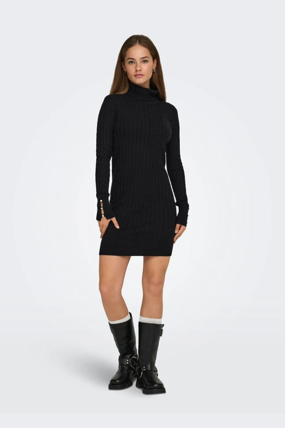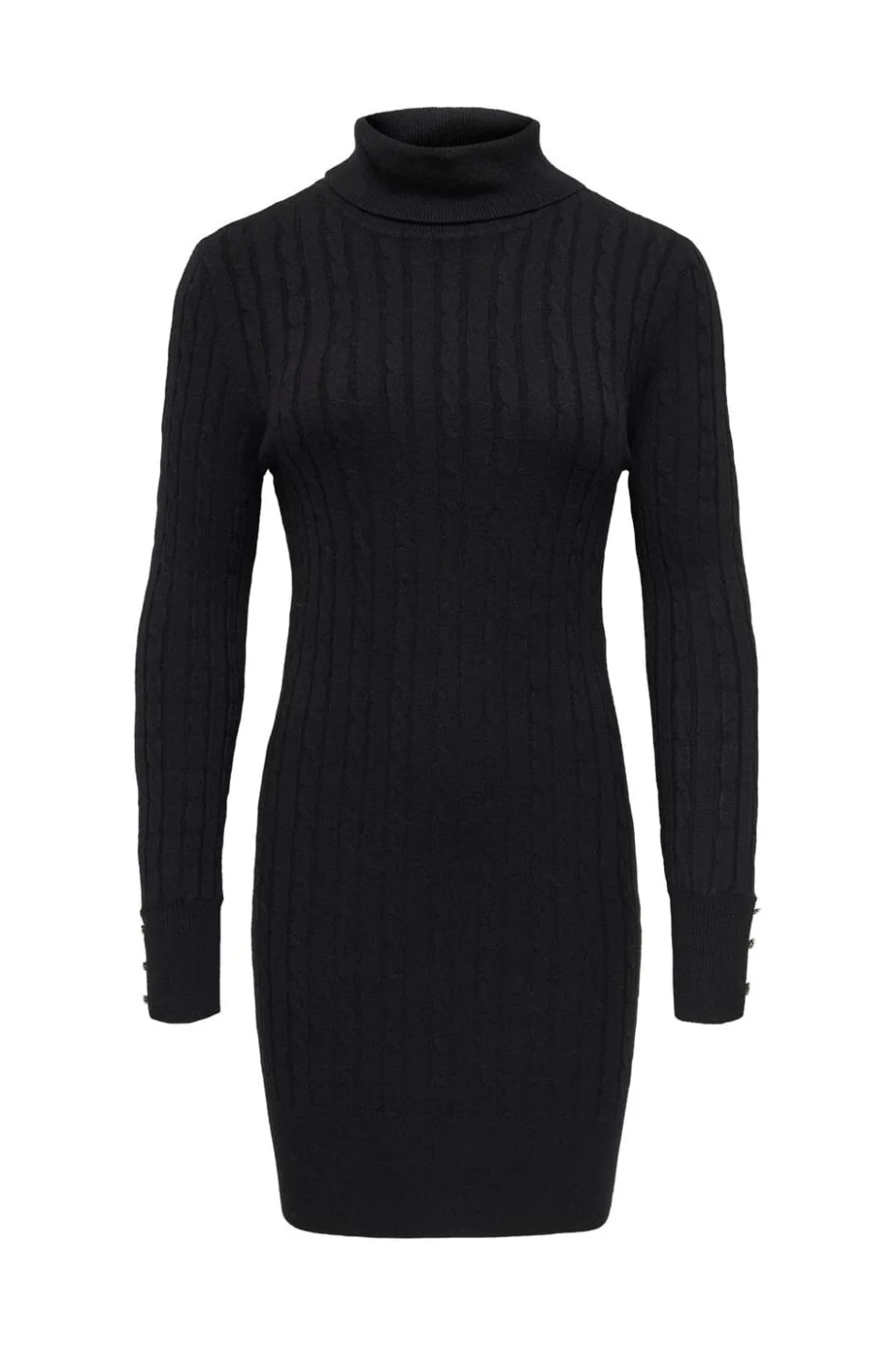 Sort strikkjole fra Only med kabelstrikmønster. Kjolen har en rullekrave og lange ærmer med knappedetaljer på manchetterne.
