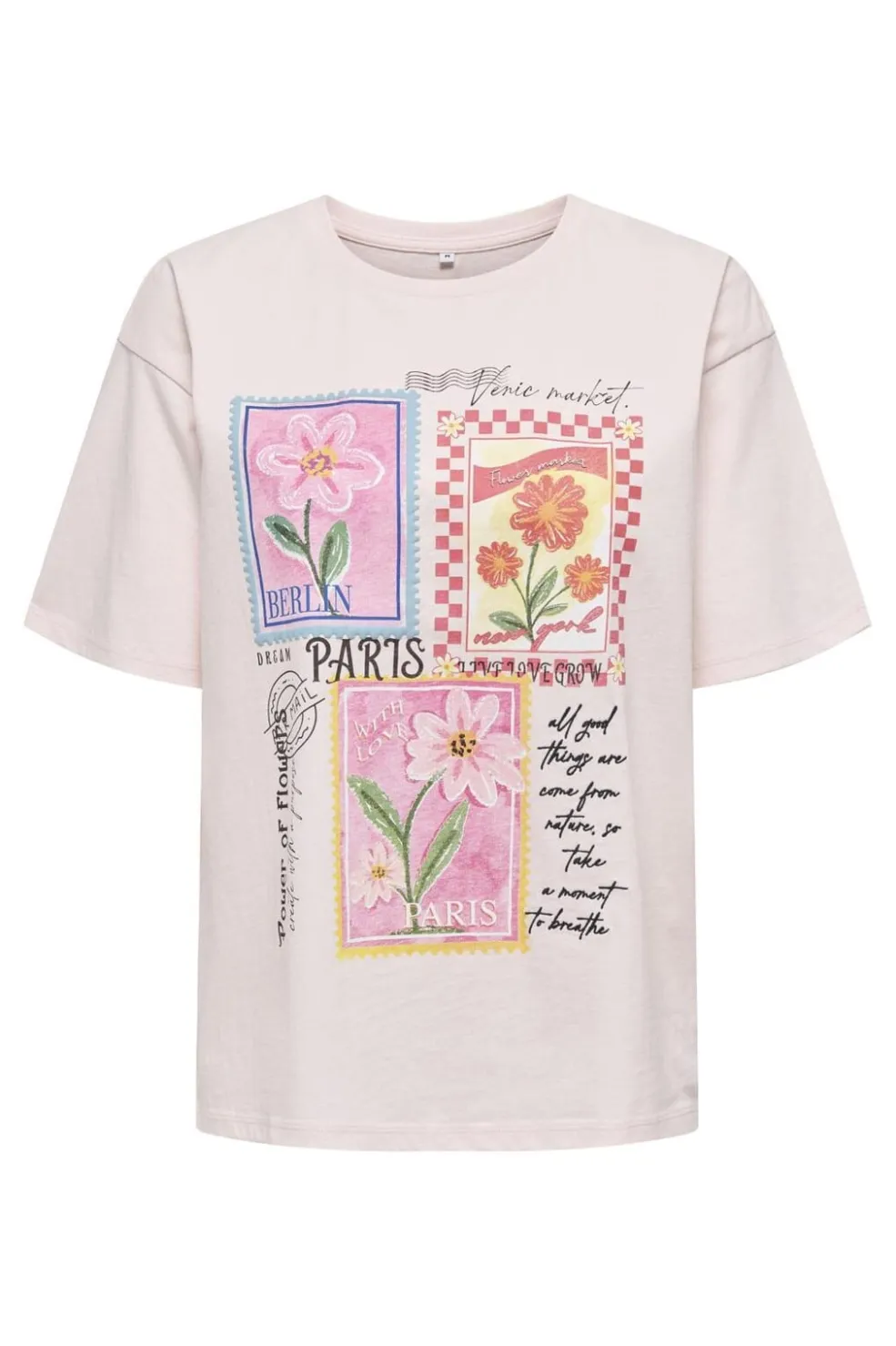 T-shirt fra Only i isende pink med blomstermotiver og bystempler. Den runde halsudskæring og de korte ærmer giver en klassisk t-shirt-silhuet med sænkede skuldersømme.