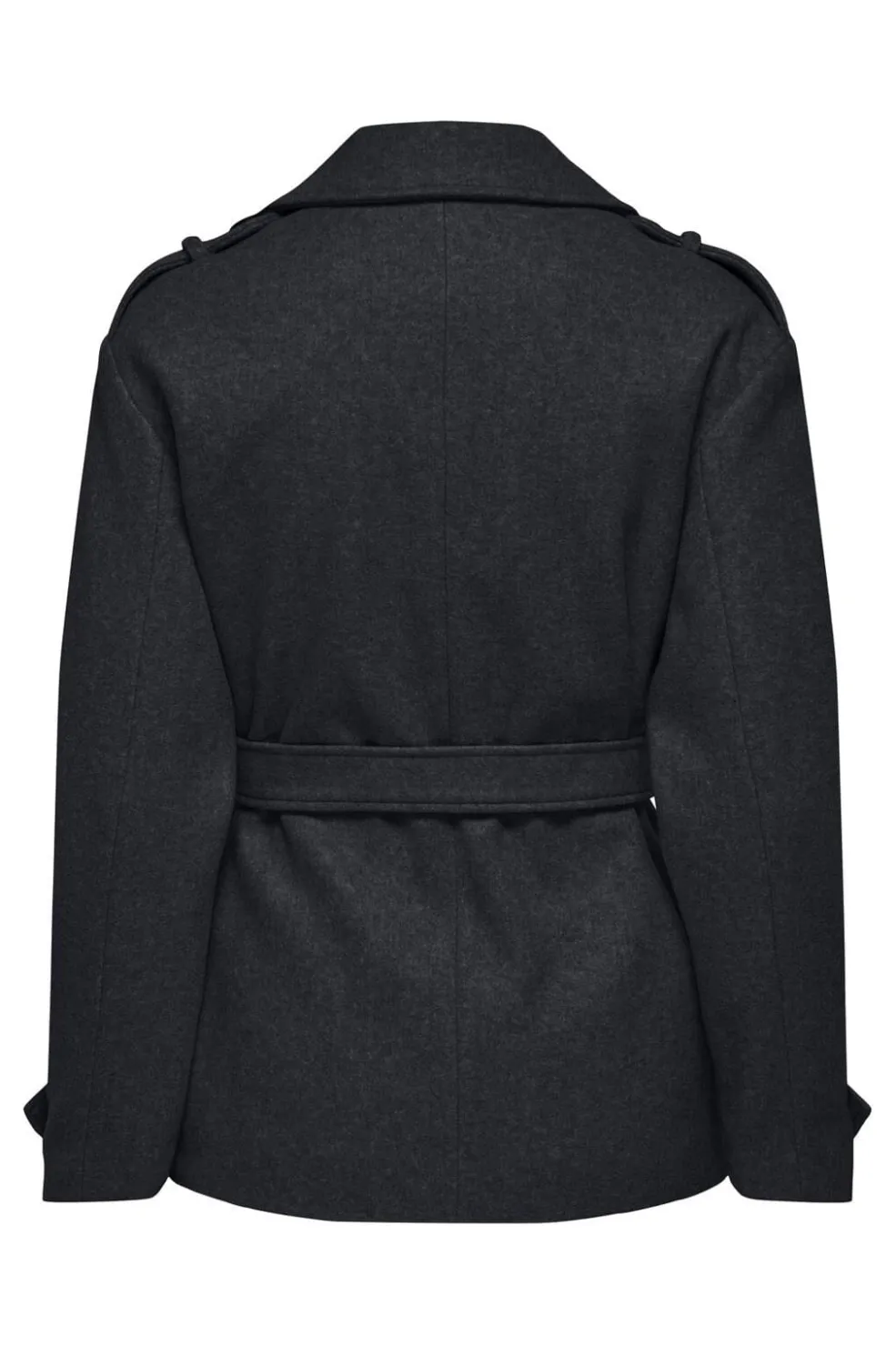 Kort trenchcoat fra Only i en mørkeblå melange-nuance. Jakken har skjortekrave, knapper foran og et bælte i taljen. Det forede materiale giver god komfort.