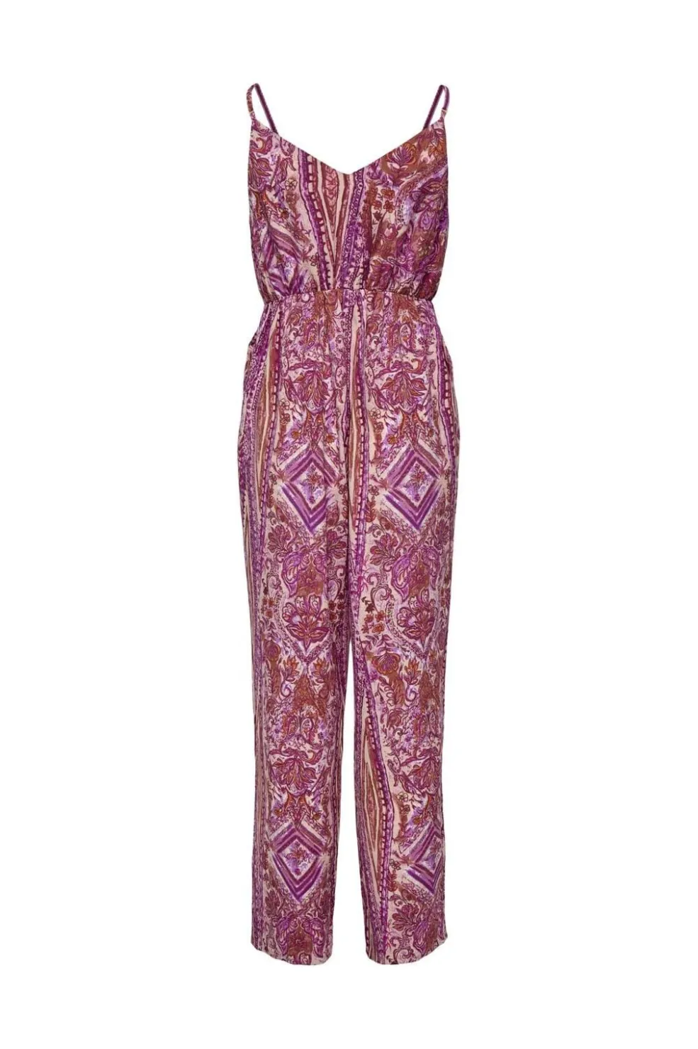 Jumpsuit fra Only i vævet stof med mønster i fuchsia og brune nuancer. Den har en løs pasform med elastisk talje og tynde stropper.