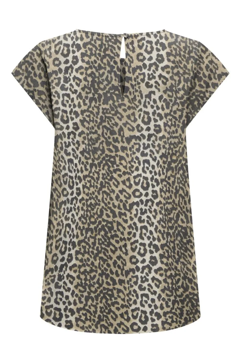 Kortærmet top fra Only med leopardmønster i beige og grå nuancer. Toppen har en rund halsudskæring og knapper i nakken som detalje.