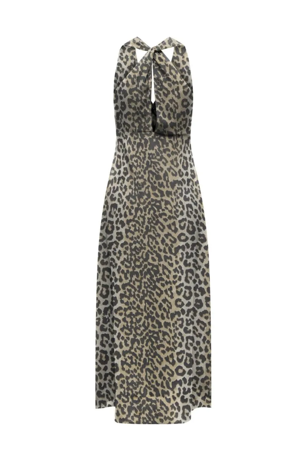 Lang kjole fra Only med leopardprint i beige og sort. Kjolen har halterneck-design med sløjfe og en V-udskæring. Den lange længde og lette struktur giver kjolen et rent udtryk.