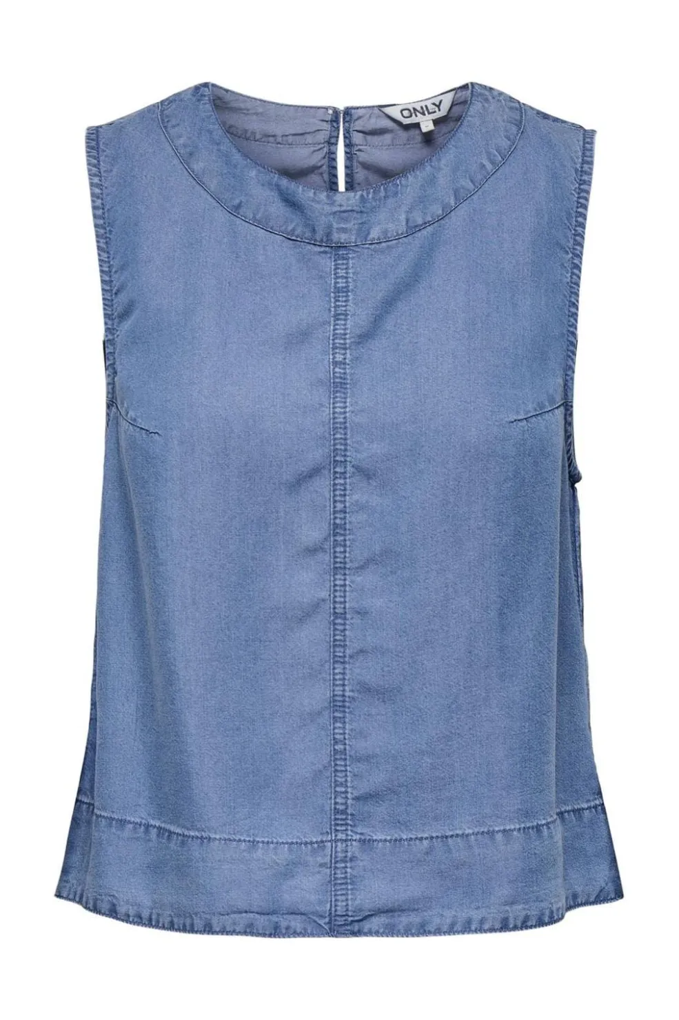 Ærmeløs top fra Only i medium blå denim. Toppen har en rund halsudskæring og dekorative syninger, der giver struktur til det bløde Lyocell-materiale.