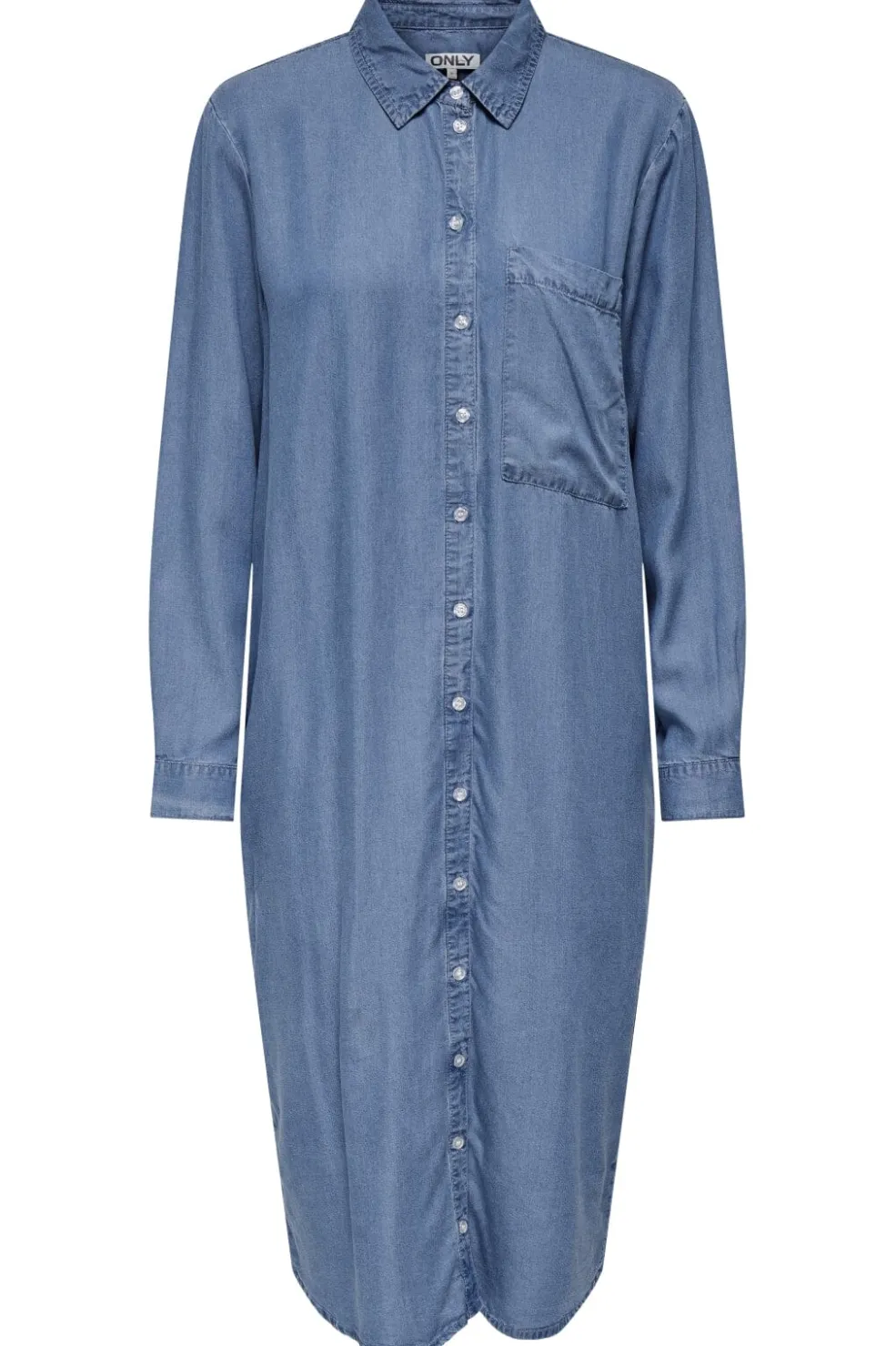 Midi-kjole fra Only i mellemblå denim. Kjolen har skjortekrave, knaplukning hele vejen ned og en brystlomme.