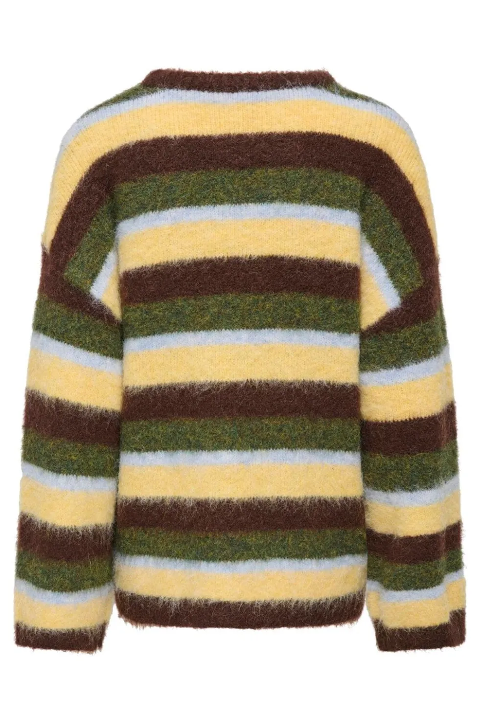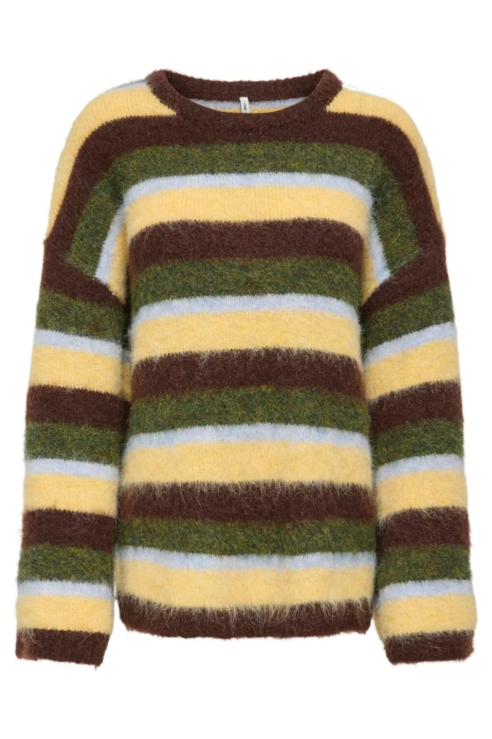 Stribet striktrøje fra Only med vandrette striber i brun, grøn, gul og lyseblå. Striktrøjen har rund halsudskæring og lange ærmer med sænkede skuldersømme.