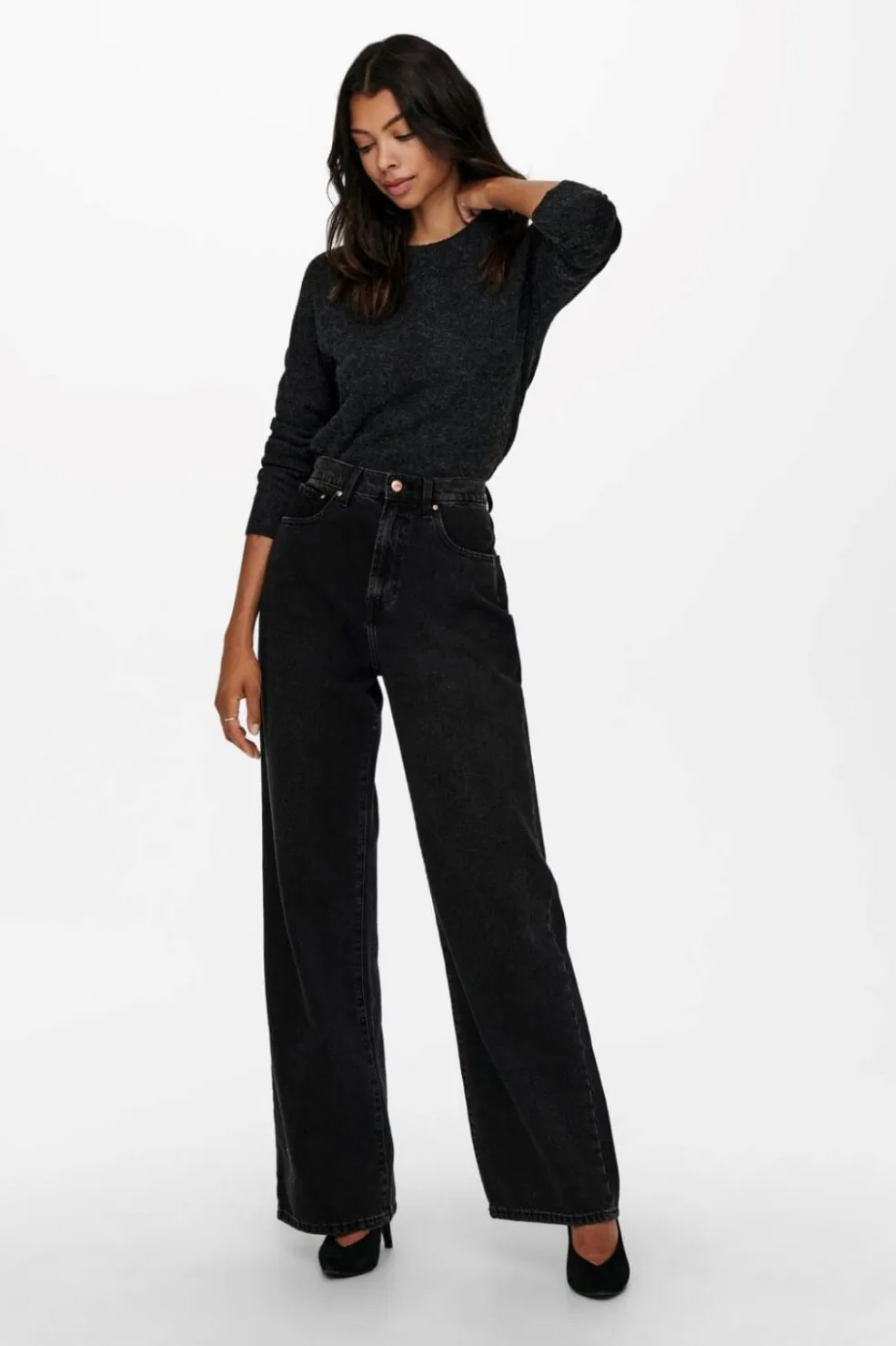 Sort meleret strikbluse med lange ærmer og rund halsudskæring. Den regulære pasform giver god bevægelsesfrihed, mens det melerede udtryk skaber dybde i designet.