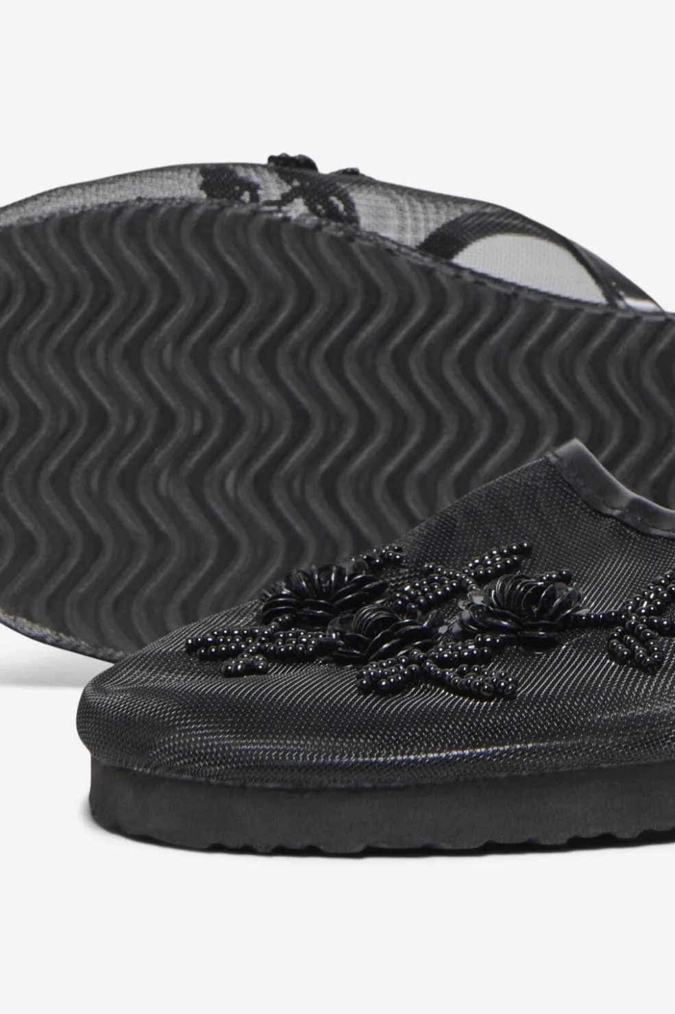 Sorte slippers fra Only Shoes med mesh-design. Slippersene har blomsterformede perledetaljer og pailletter på overdelen, som giver et fint udtryk til det enkle design.