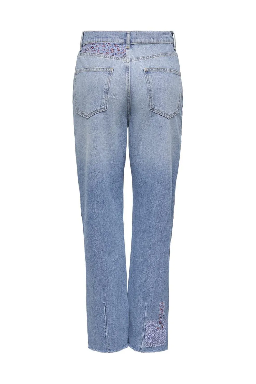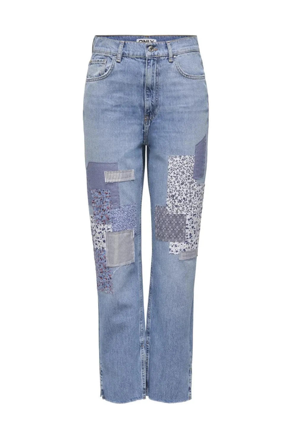 Straight jeans i medium blå denim med patchwork af forskellige blå stoffer og blomstermønstre. Bukserne har en loose fit og slidser i benene, der giver et unikt udtryk.
