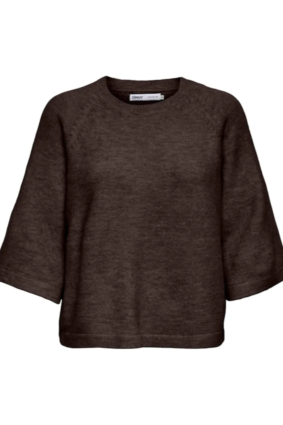 Mørkebrun strikpullover fra Only med trekvartlange ærmer og rund hals. Pulloveren har en regular fit-pasform og er fremstillet i en blød melange-strik.