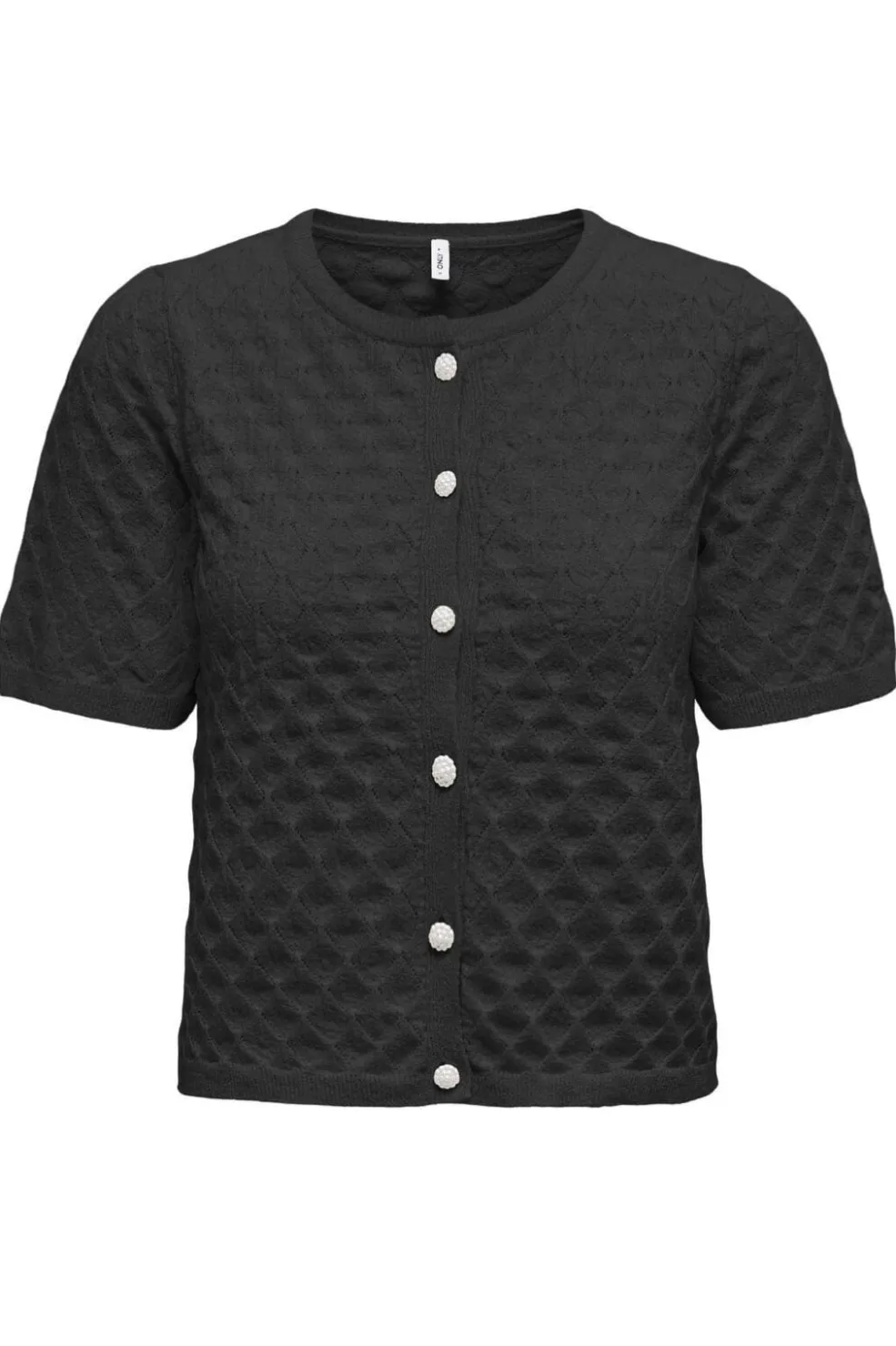 Sort cardigan fra Only med struktureret fladstrik. Den har rund hals, korte ærmer og perleknapper foran. Strikken har et design med mønstre og en regular fit.
