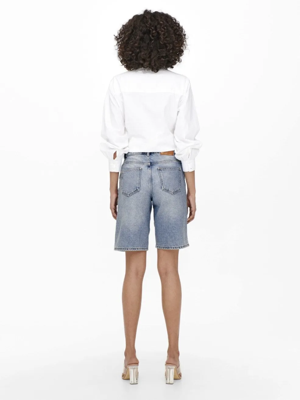 Lyseblå denimshorts fra Only med høj talje og bred pasform. Shortsene har en knælængde og er lavet i et rent bomuldsstof med en lys sommervask.