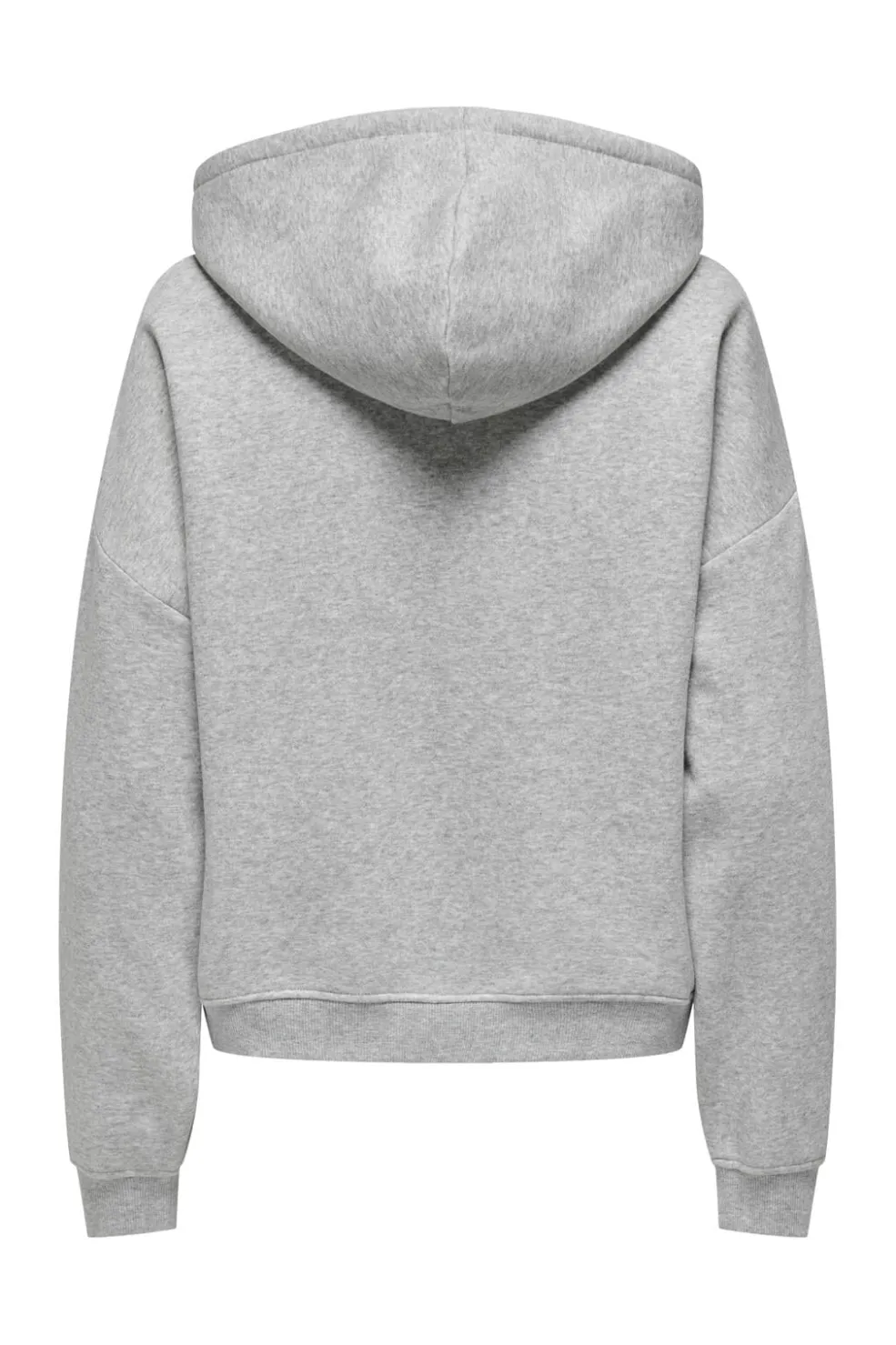 Lys grå hættetrøje fra Only med loose fit-pasform. Den har lange ærmer og en praktisk kængurulomme foran. Hætten kan justeres med snore.