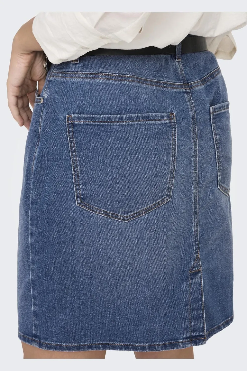 Denimnederdel fra Only i mellemblå. Den har høj talje med bæltestropper og praktiske lommer både foran og bagpå. Lynlås og knapper sikrer en god lukning.