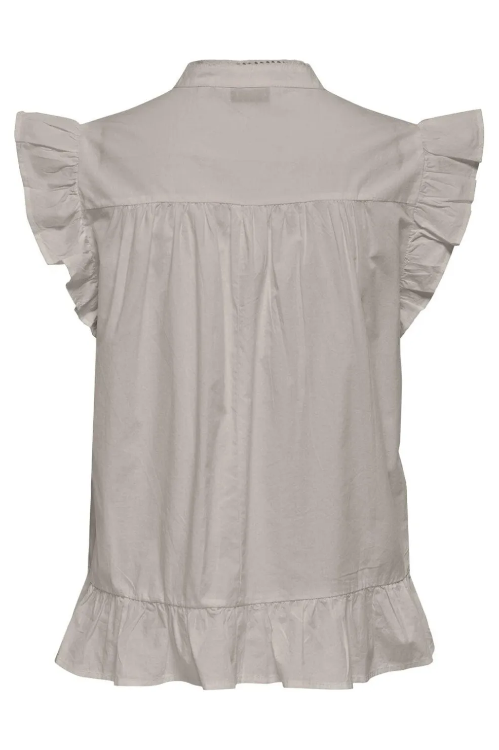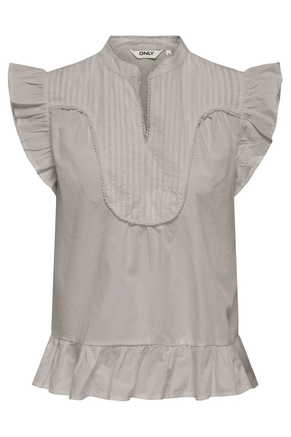 Grå top fra Only med V-hals og flæseærmer. Toppen har et plisseret design på fronten og en flæset kant forneden. Den er fremstillet i en lys grå nuance med et feminint udtryk.