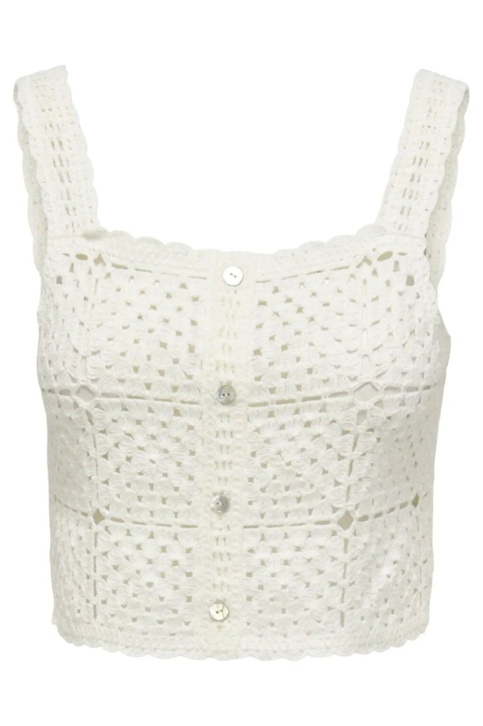 Hvid hæklet top fra Only med firkantet halsudskæring og brede stropper. Den har knaplukning foran og et gennemgående hæklet mønster i en lys egret-farve.