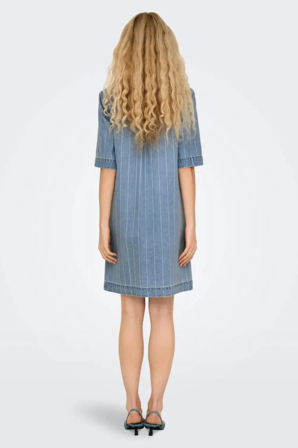 Lyseblå denimkjole fra Only med striber og skjortekrave. Kjolen har korte, boxy ærmer og en praktisk brystlomme. Metalknapper pryder forsiden fra kraven til kanten.