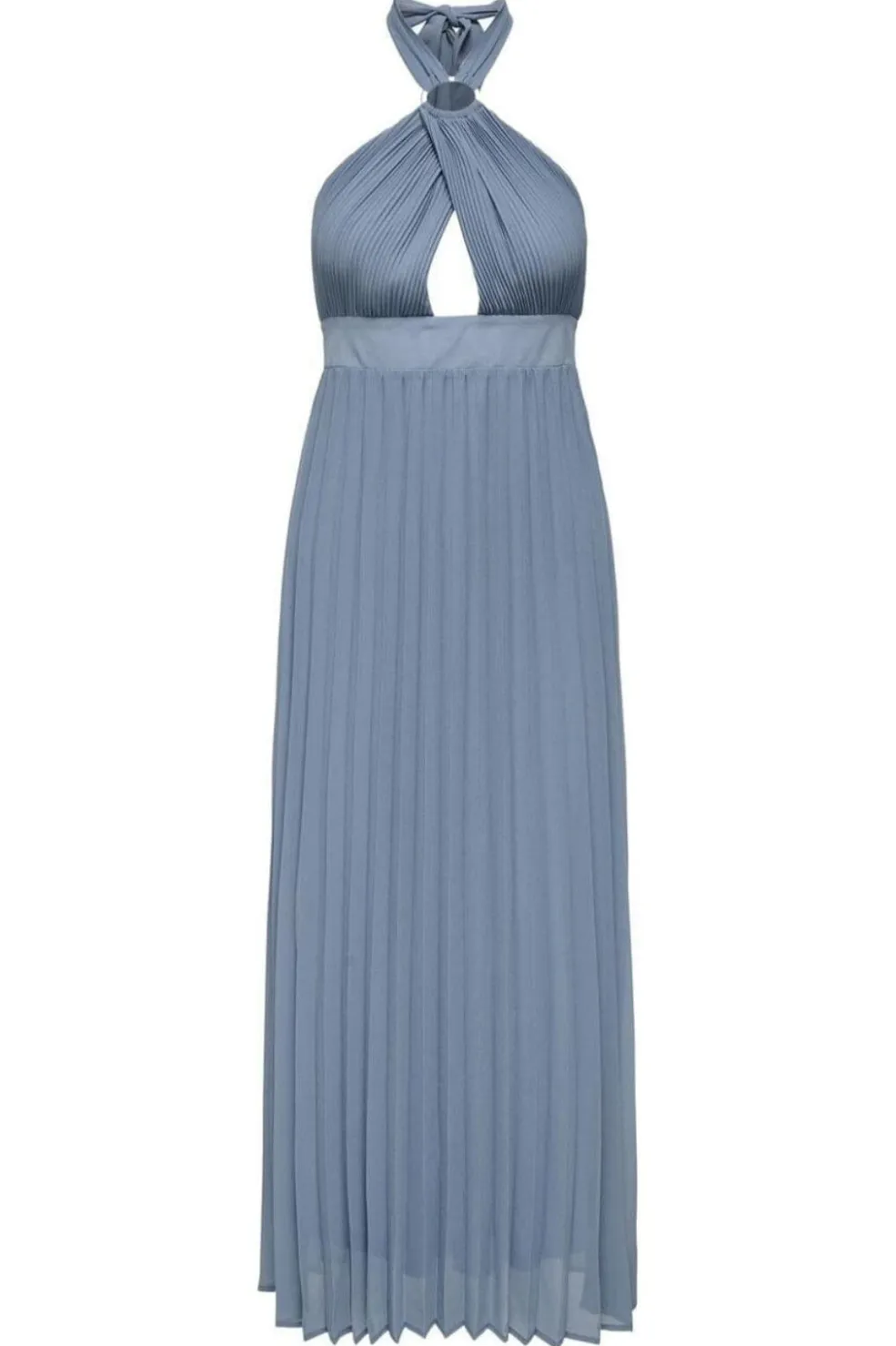 Lang kjole fra Only i lyseblå. Kjolen har et plisseret design med halterneck og sløjfe ved nakken. Den gulvlange silhuet og det ærmeløse design passer til festlige anledninger.