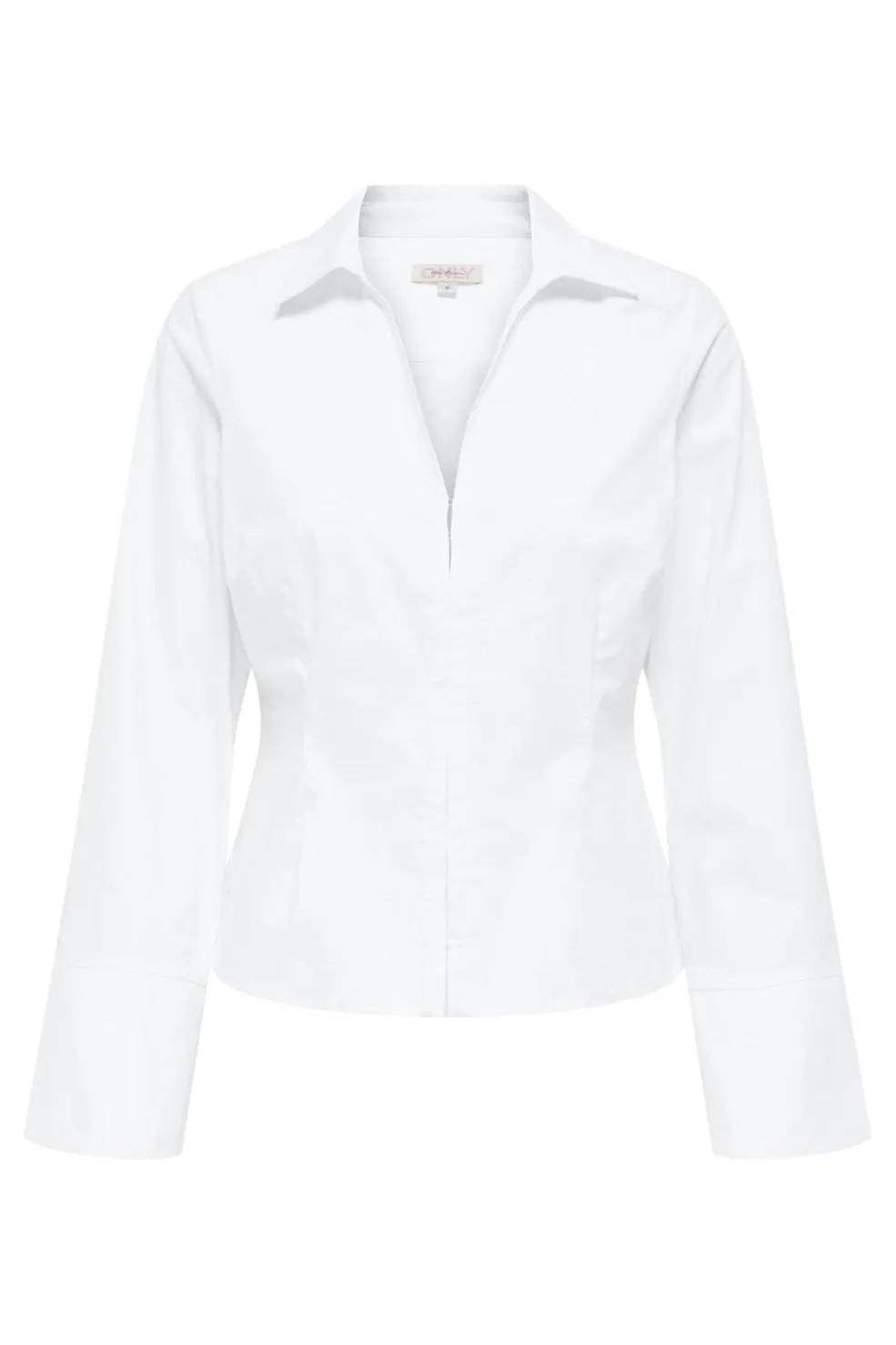 Hvid skjorte fra Only, lavet af 100 % bomuld. Skjorten har en slim fit-pasform og lukkes med hægter foran.