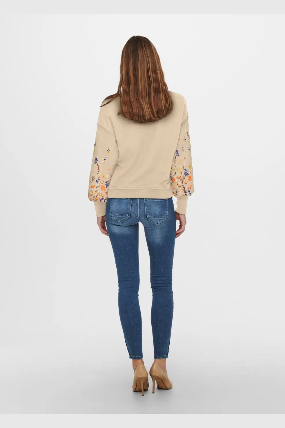 En sweatshirt fra Only i lys khaki med blomsterdesign på ærmerne. Sweatshirten har en rund halsudskæring og en afslappet pasform.
