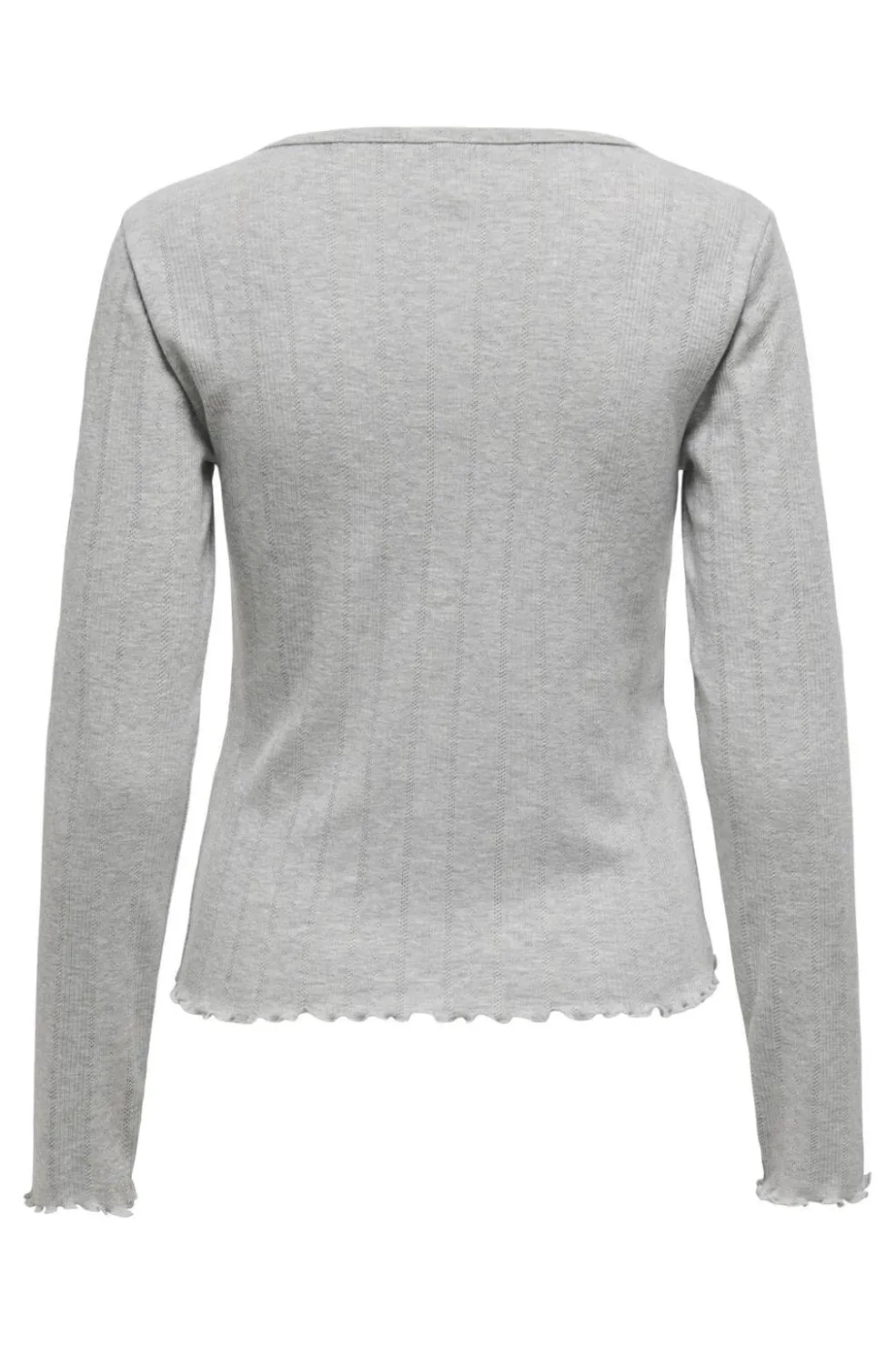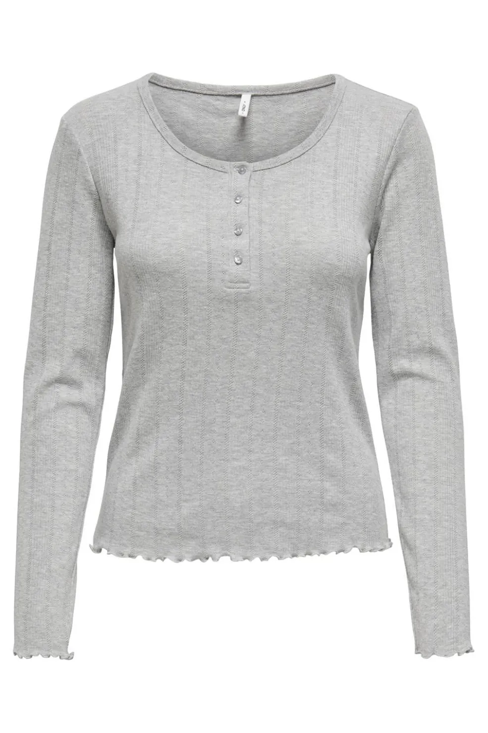 Lysegrå langærmet top fra Only med O-halsudskæring og knapdetaljer. Toppen har en bølget kant forneden og er fremstillet i et blødt meleret stof.