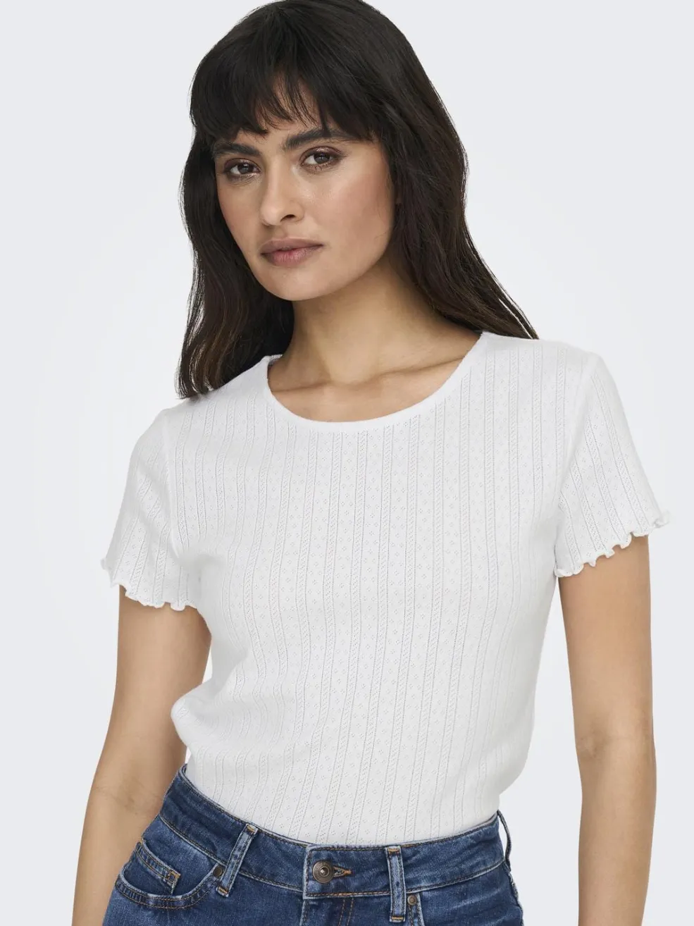 Hvid kortærmet top fra Only med ribbet tekstur. Toppen har en tætsiddende pasform, rund halsudskæring og bølgede kanter på ærmerne, der giver et feminint præg.