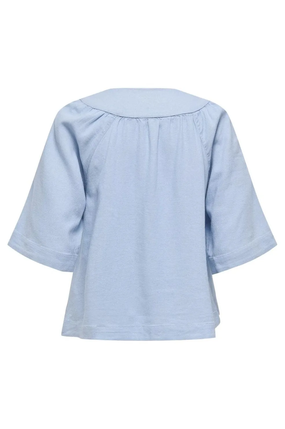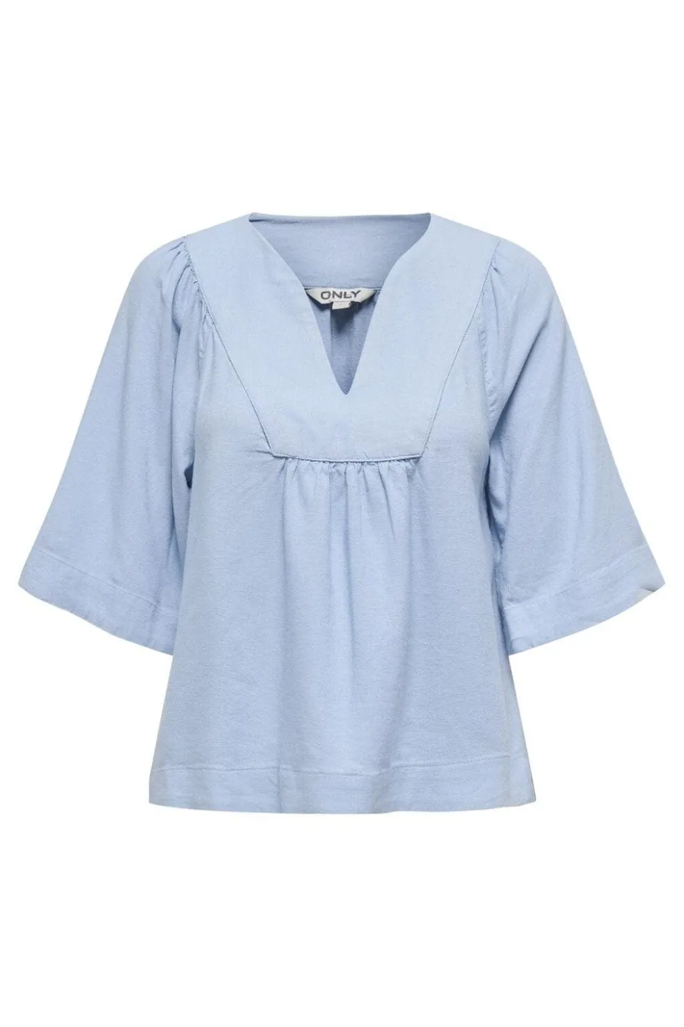 Lyseblå top fra Only med V-halsudskæring og løs pasform. Toppen er lavet i en blanding af hør og viskose med 3/4-ærmer og samling ved brystpartiet.
