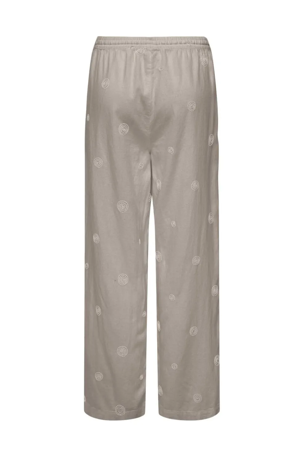 Beige bukser fra Only med brede ben og broderede cirkler. Bukserne har en løs pasform og bindebånd i taljen, som gør dem behagelige at have på både hjemme og ude.