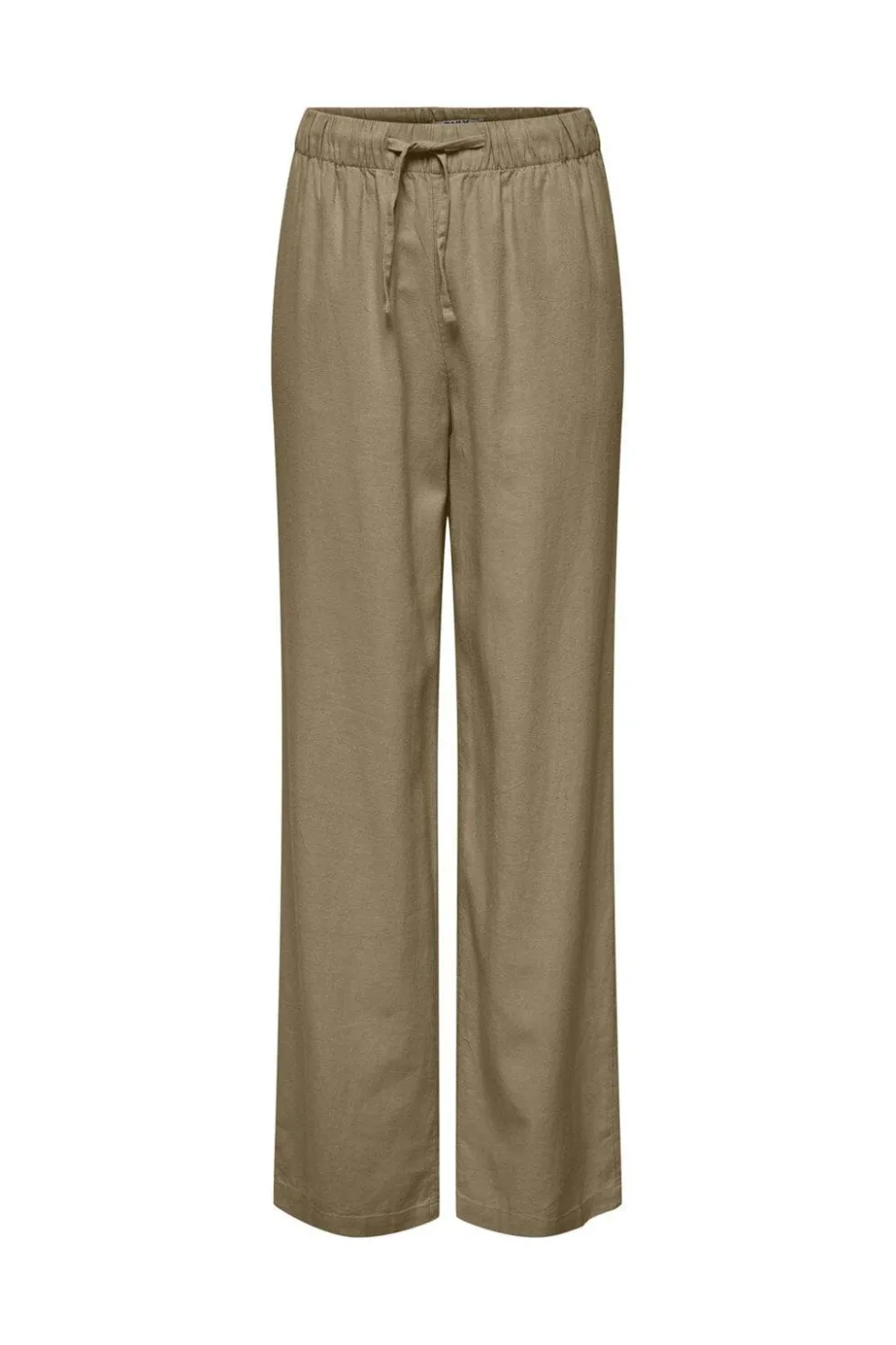 Løse bukser fra Only i en neutral elmwood-farve. Bukserne har en afslappet silhuet med brede ben og bindebånd i taljen. De lange ben giver gode stylingmuligheder året rundt.