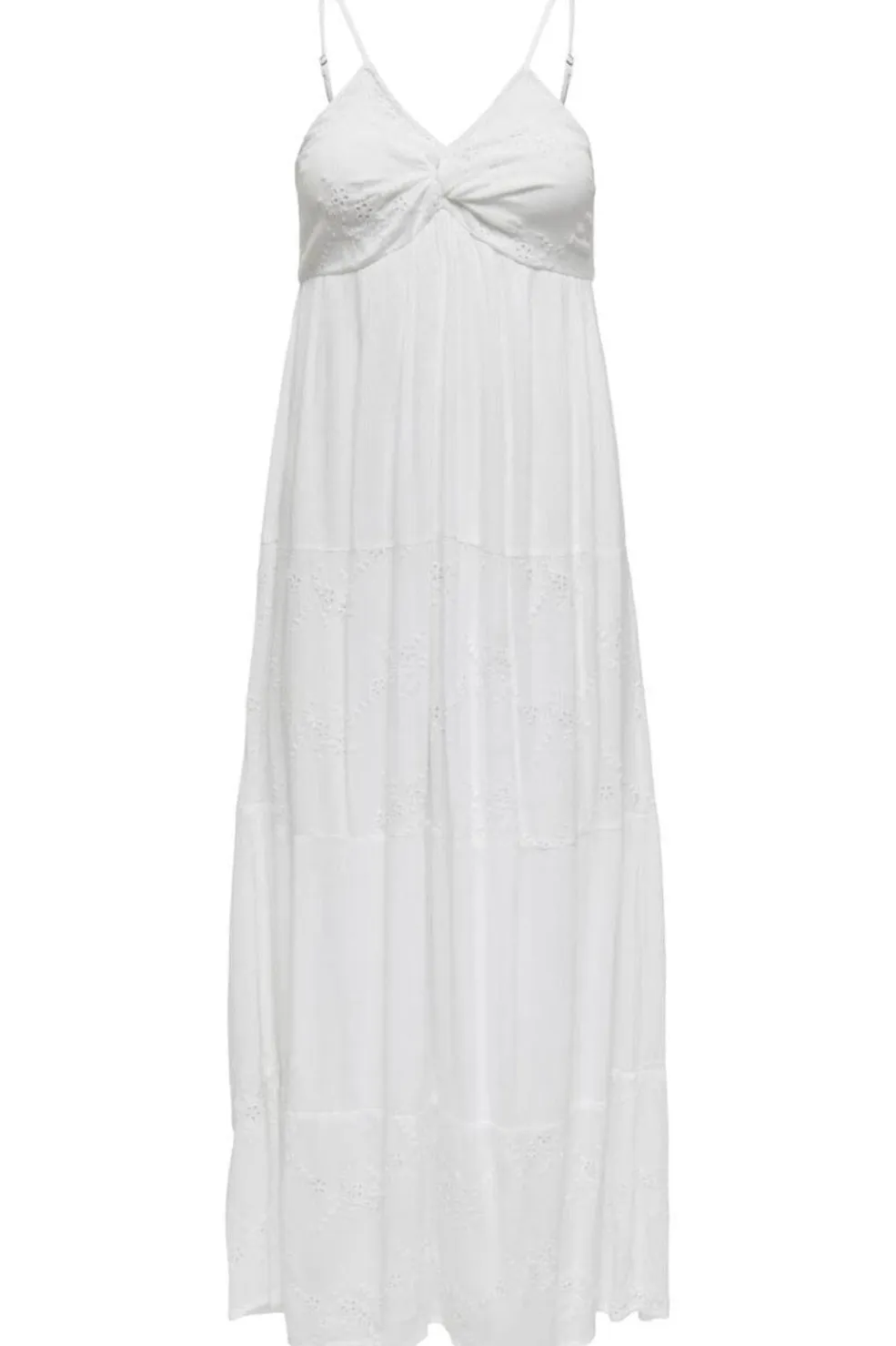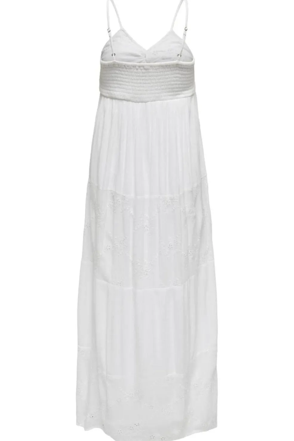 Hvid kjole fra Only med spaghettistropper og V-udskæring. Kjolen har ankellængde og fine broderidetaljer langs kanten. Den lette struktur i stoffet giver et luftigt udtryk.