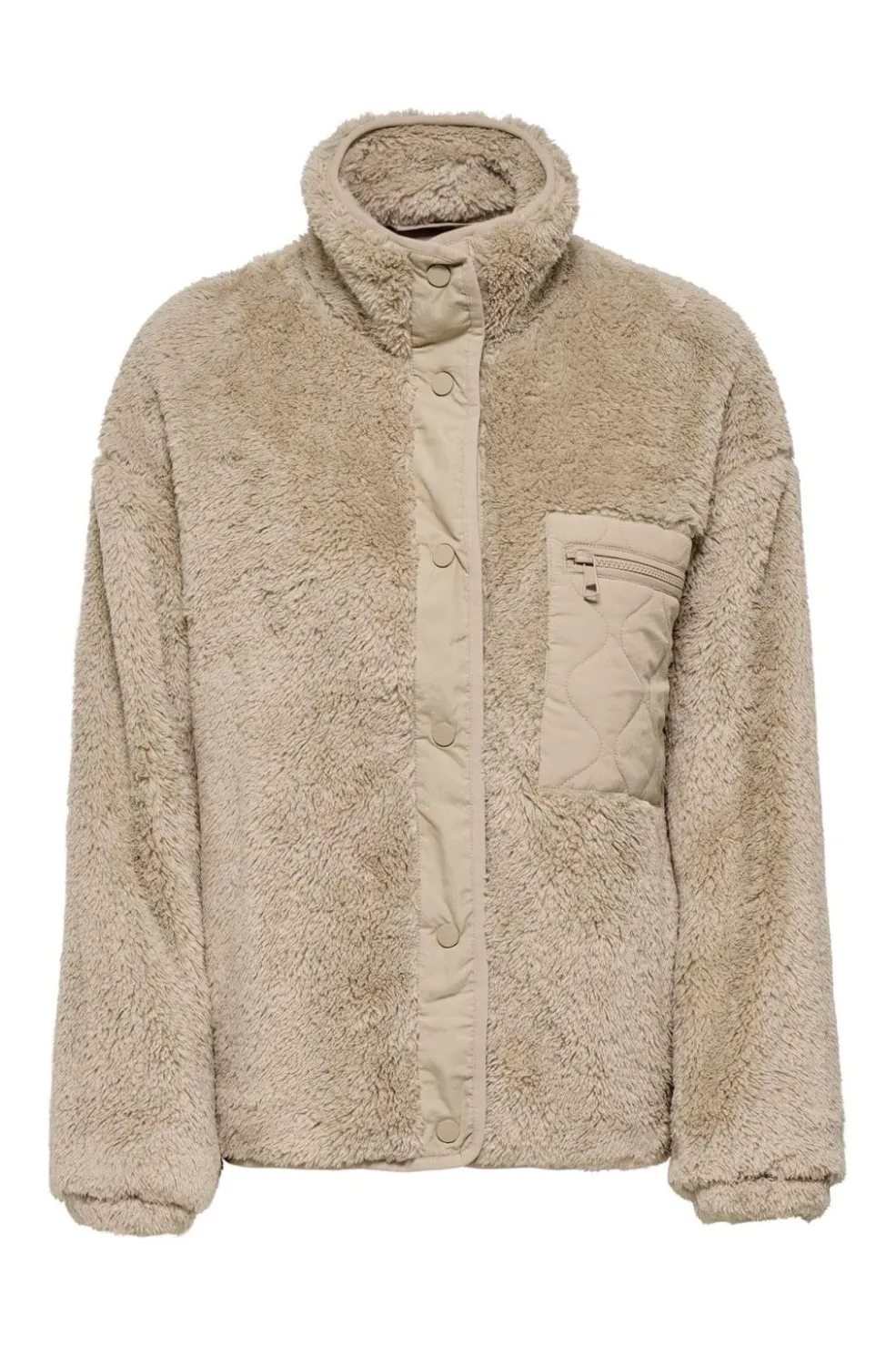Beige jakke fra Only med fluffy tekstur og høj krave. Den har en oversized pasform og er lavet af genanvendt polyester med en blød overflade og praktiske detaljer.