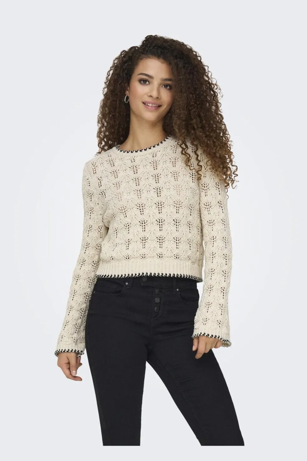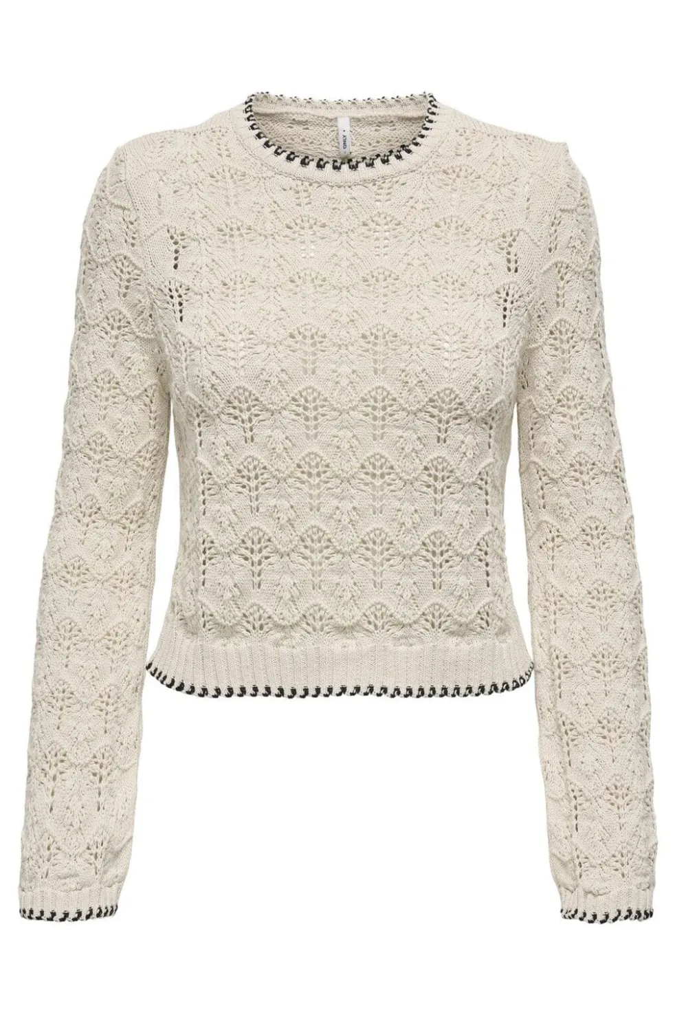 Strikket sweater fra Only i ecru med sort kontrast ved halsudskæringen og kanterne. Designet med hulmønster og lange ærmer. Den runde halsudskæring og strukturstrikken giver sweateren et karakteristisk udtryk.