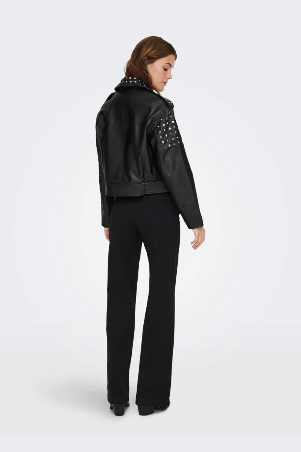 Sort bikerjakke fra Only, lavet af imiteret læder med diskret glans. Jakken har en bikerkrave og lange ærmer.