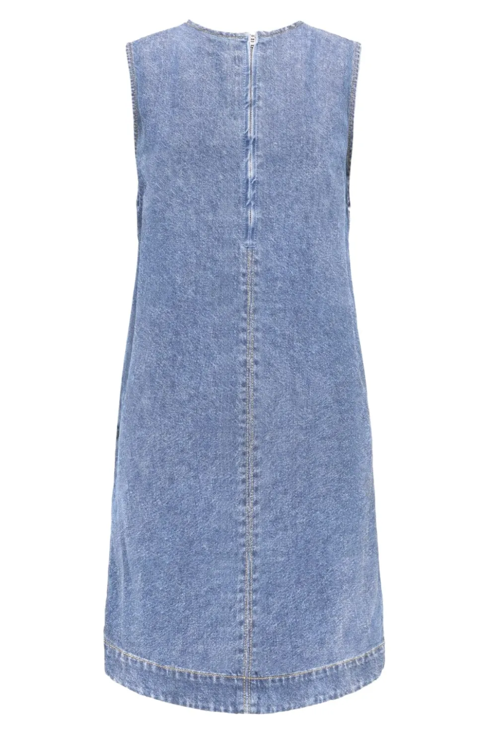 Lys blå denimkjole fra Only med rund halsudskæring. Kjolen har et ærmeløst design og en lige silhuet med lynlås bagpå. Den lyseblå denim giver et sommerligt udtryk.