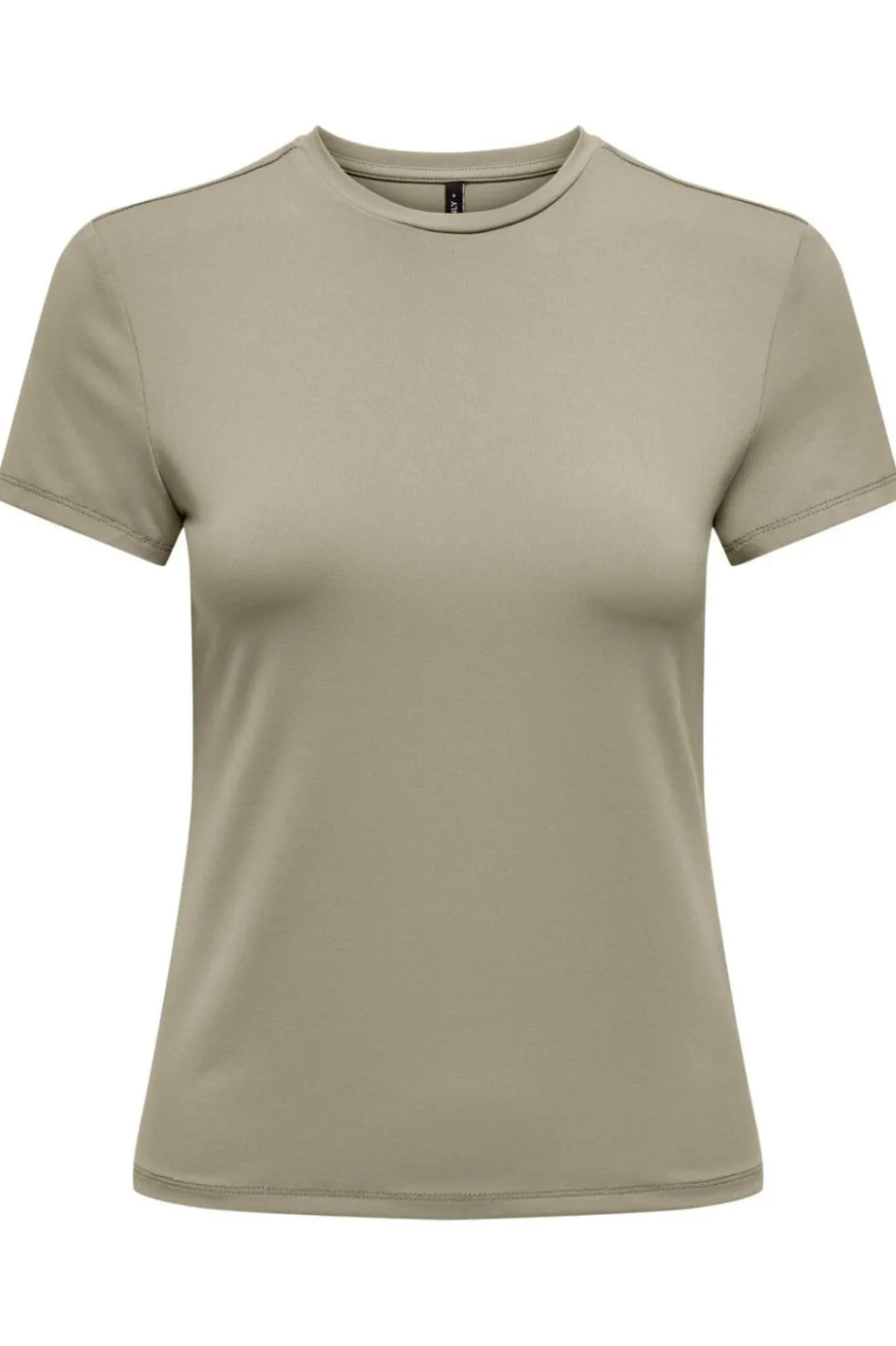 Kortærmet top fra Only i en dæmpet khaki/beige nuance. Toppen har en rund hals og regular fit, der giver god bevægelsesfrihed.